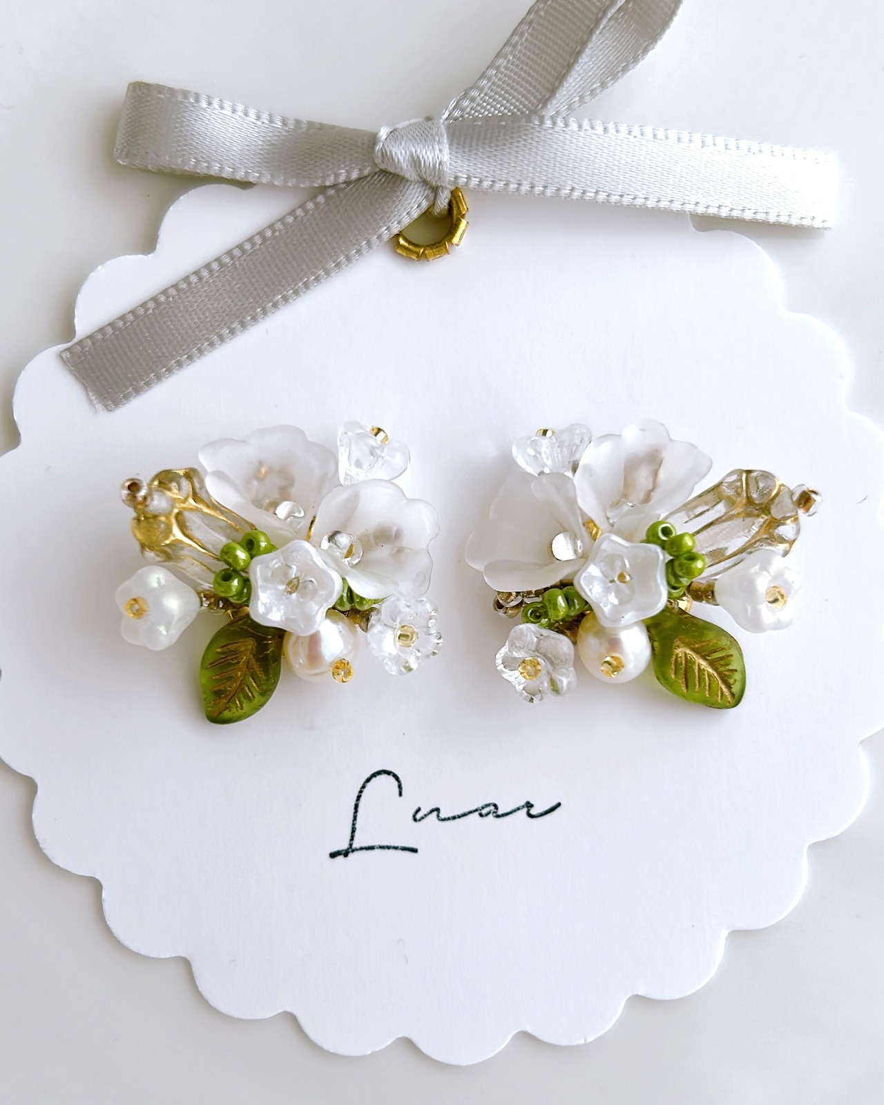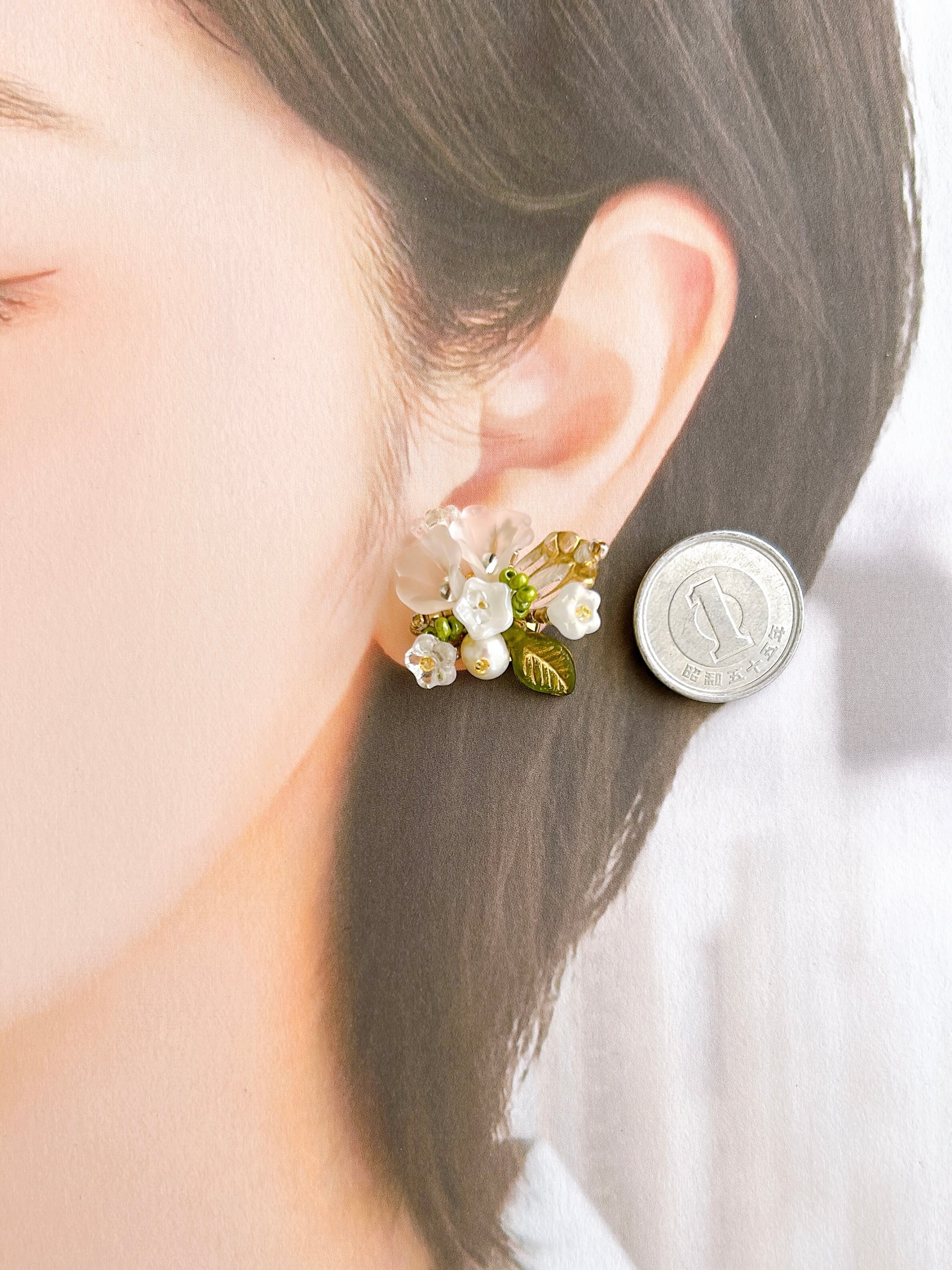 透明感のあるガラスビーズや淡いグリーンのリーフモチーフが、上品さと華やかさを耳元に添えてくれます。
