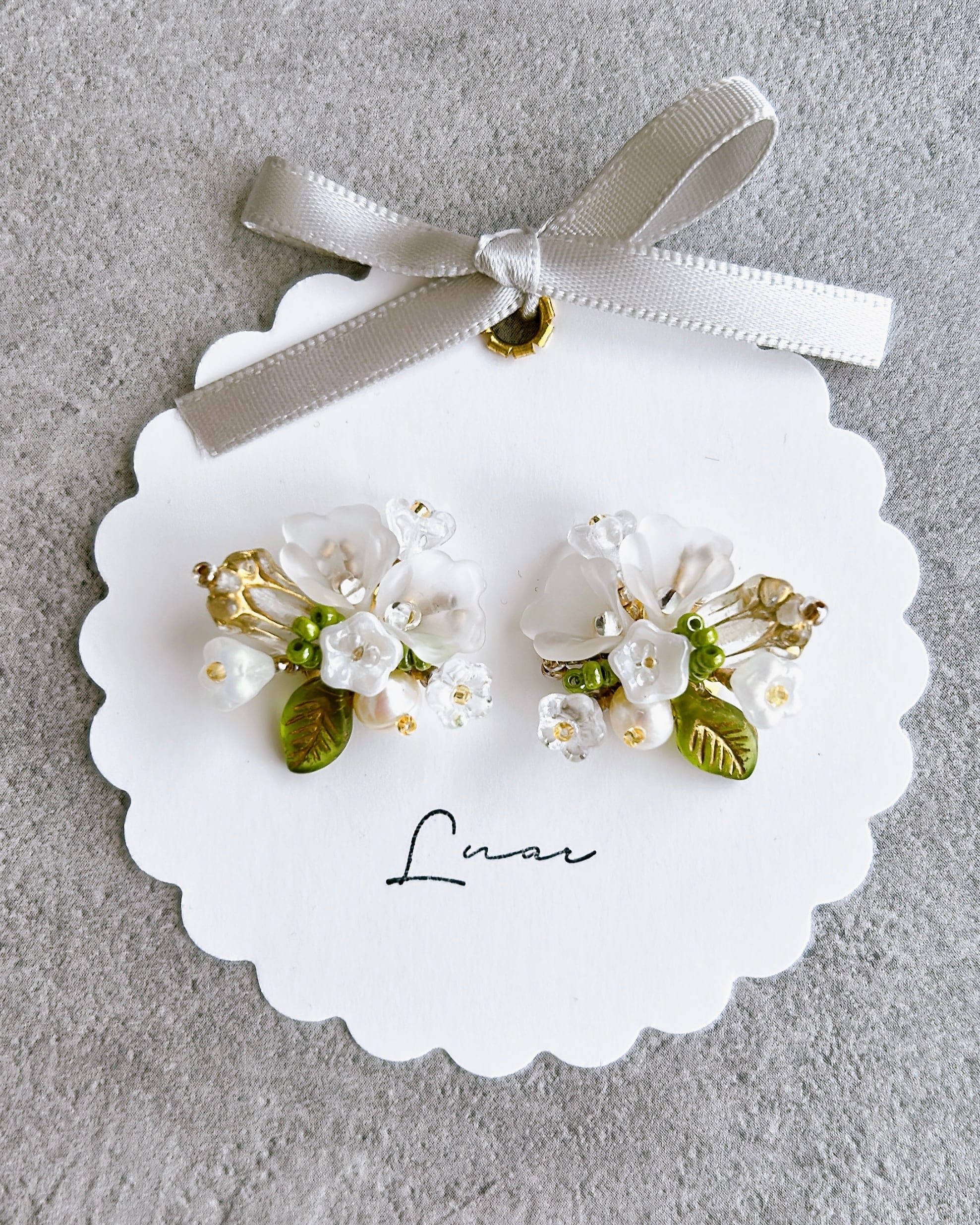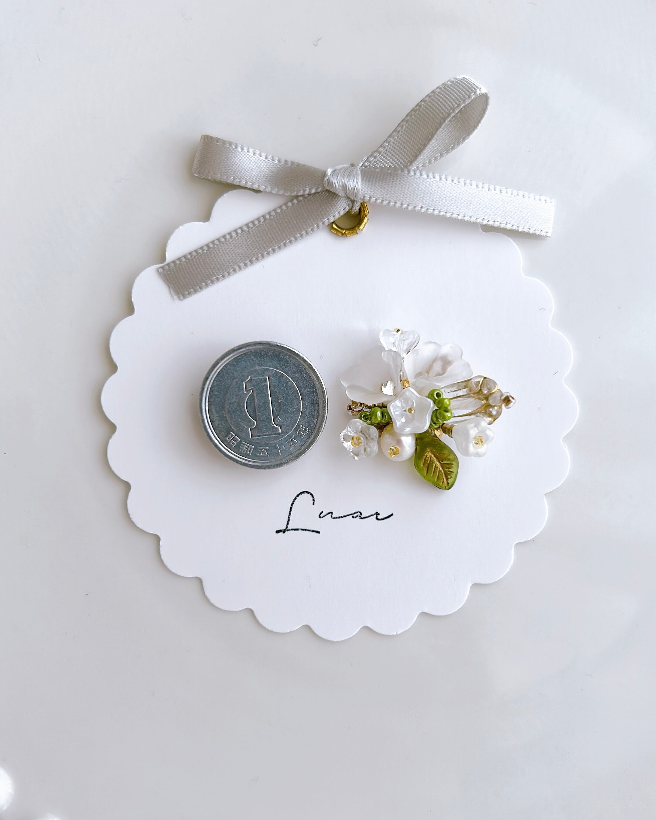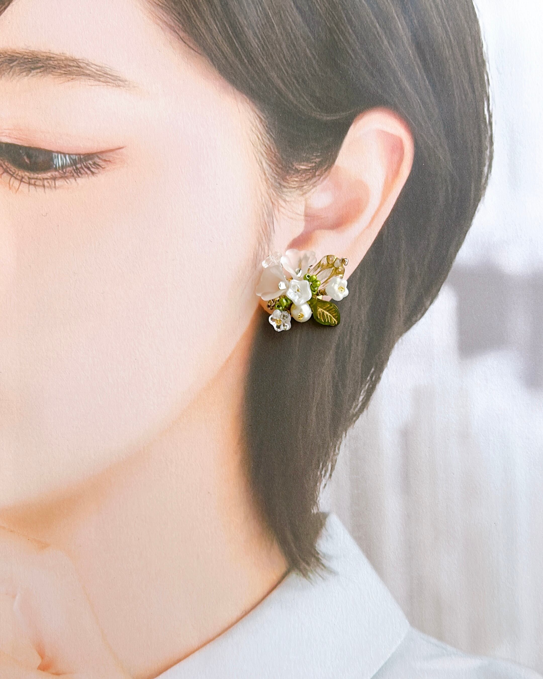 純白の小花をひとつひとつ大切に束ねて、まるで結婚式のブーケのように仕立てた耳飾り。