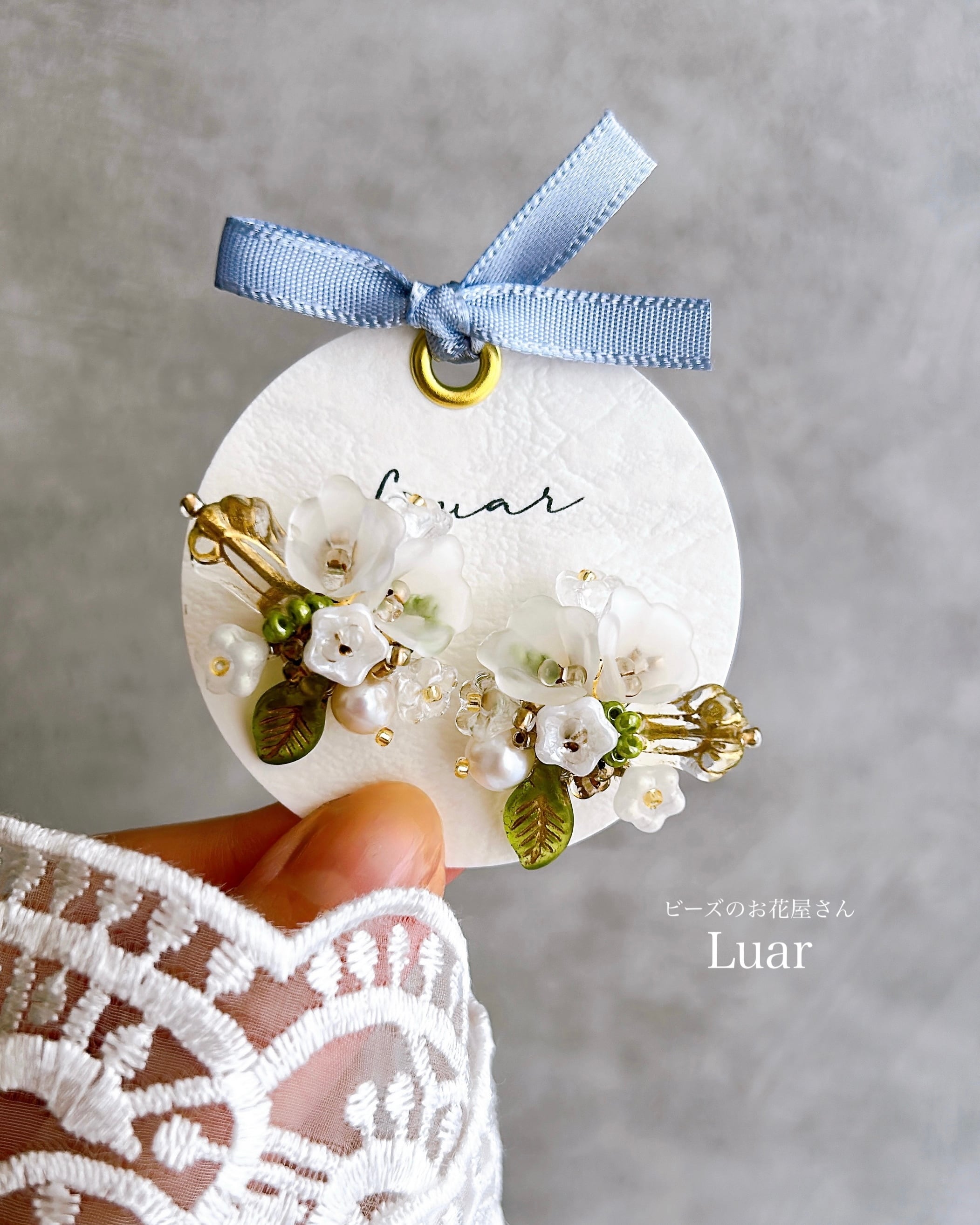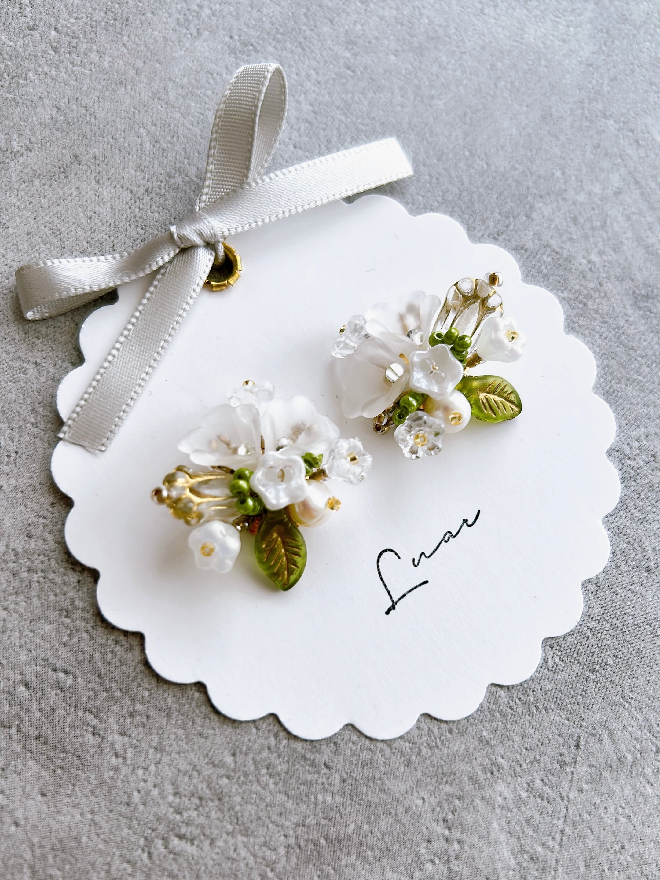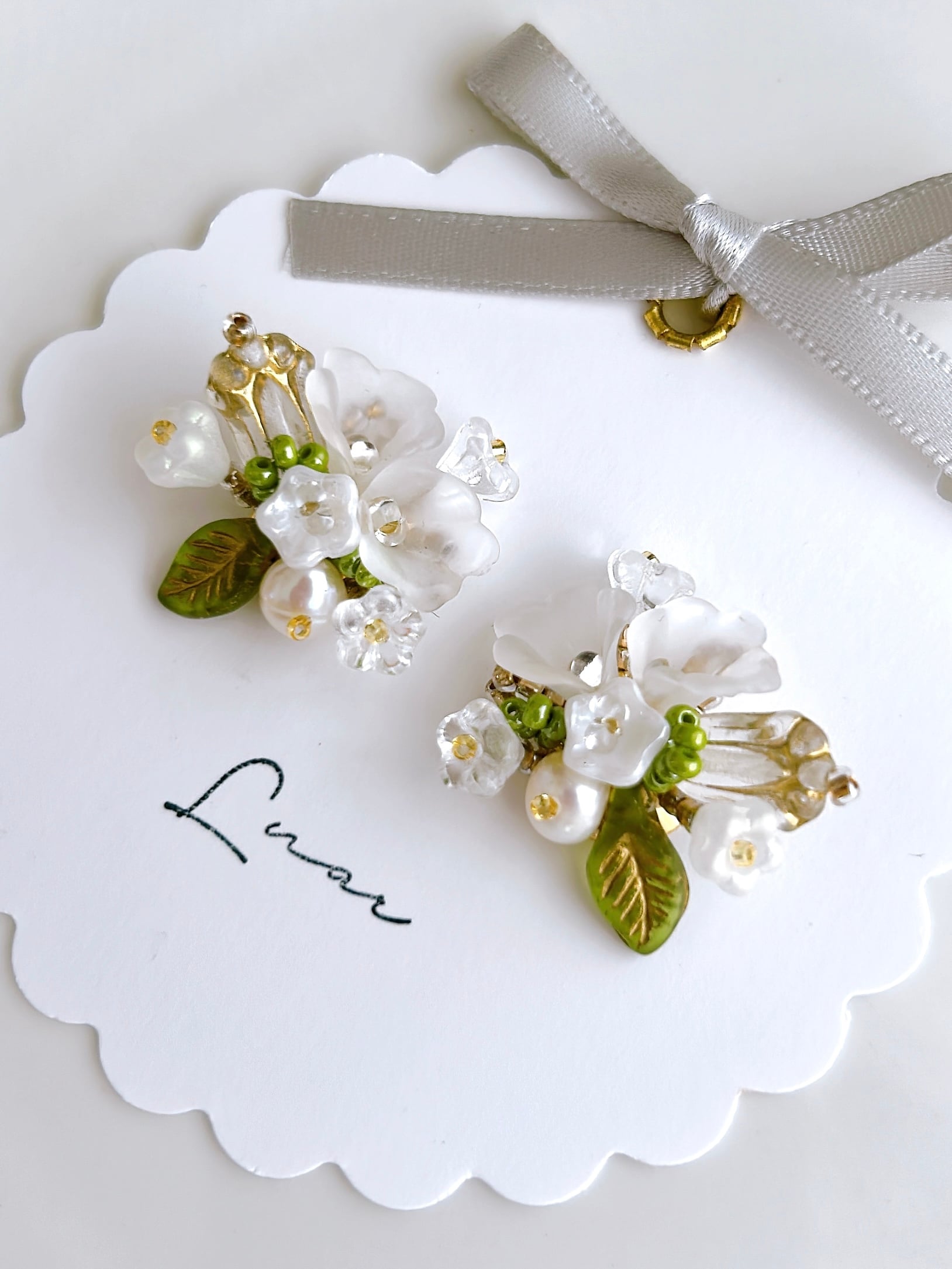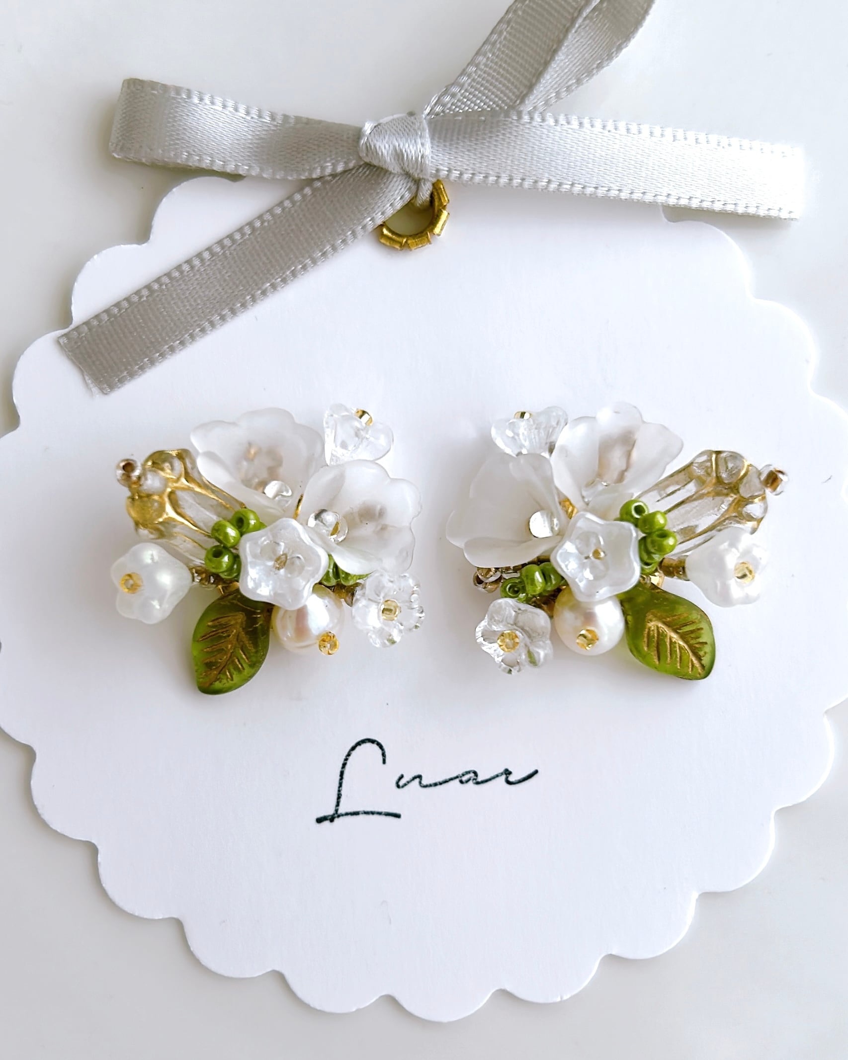 純白の小花をひとつひとつ大切に束ねて、まるで結婚式のブーケのように仕立てた耳飾り。