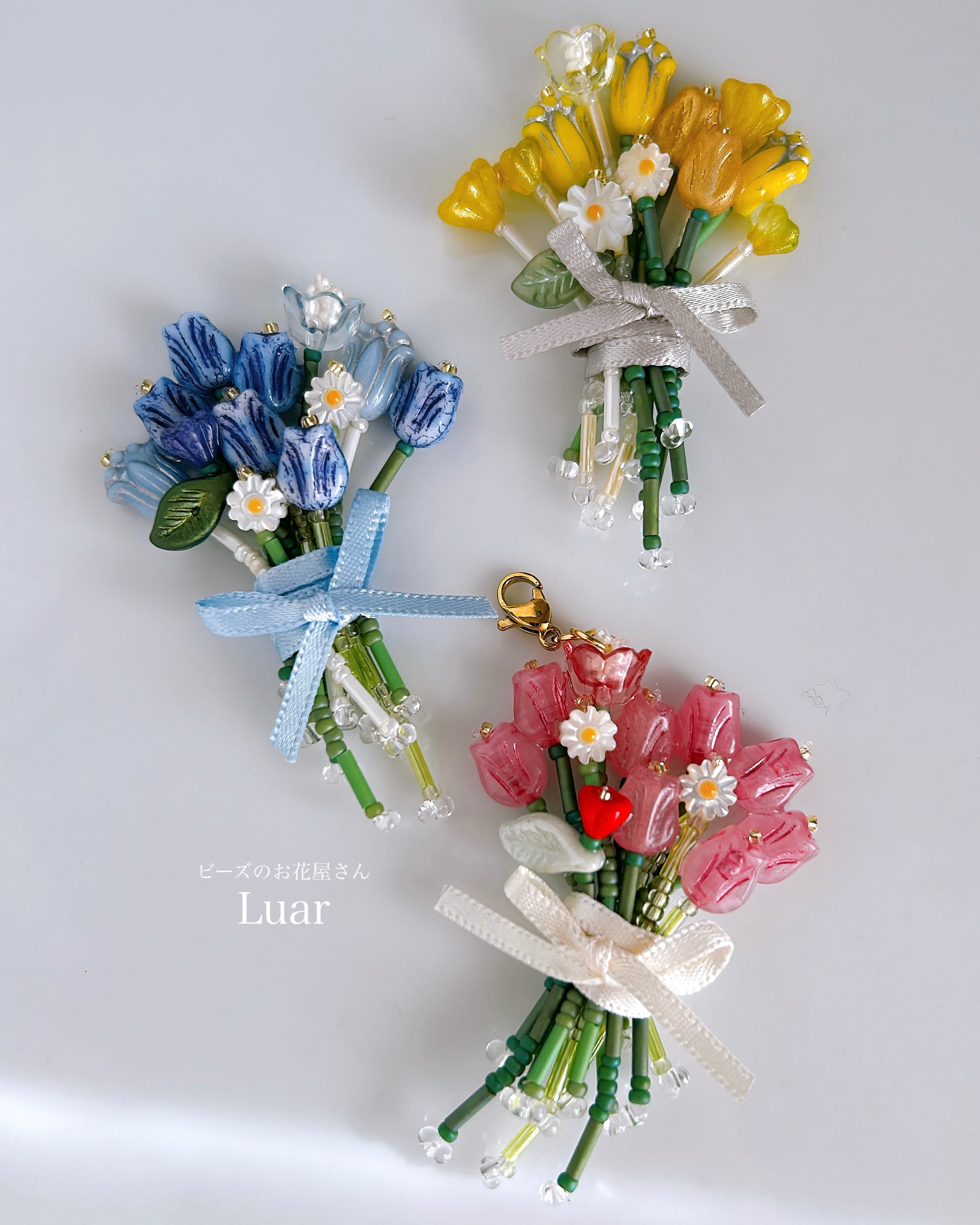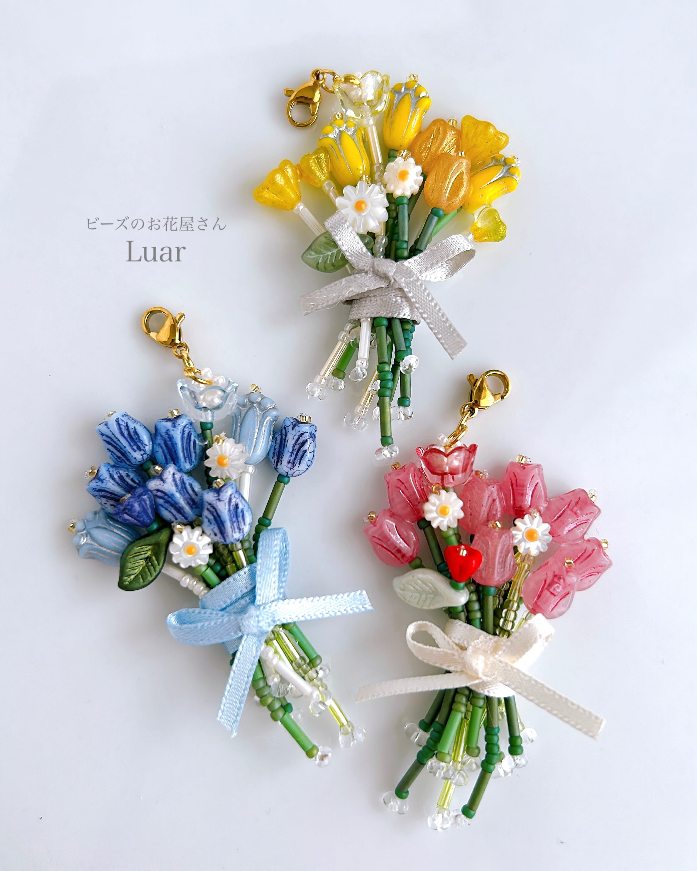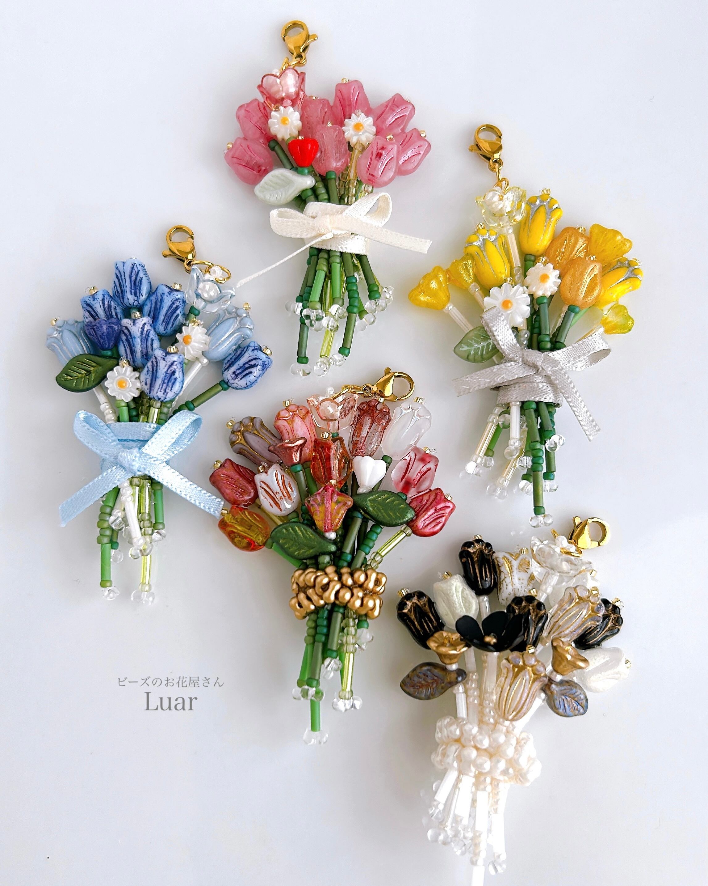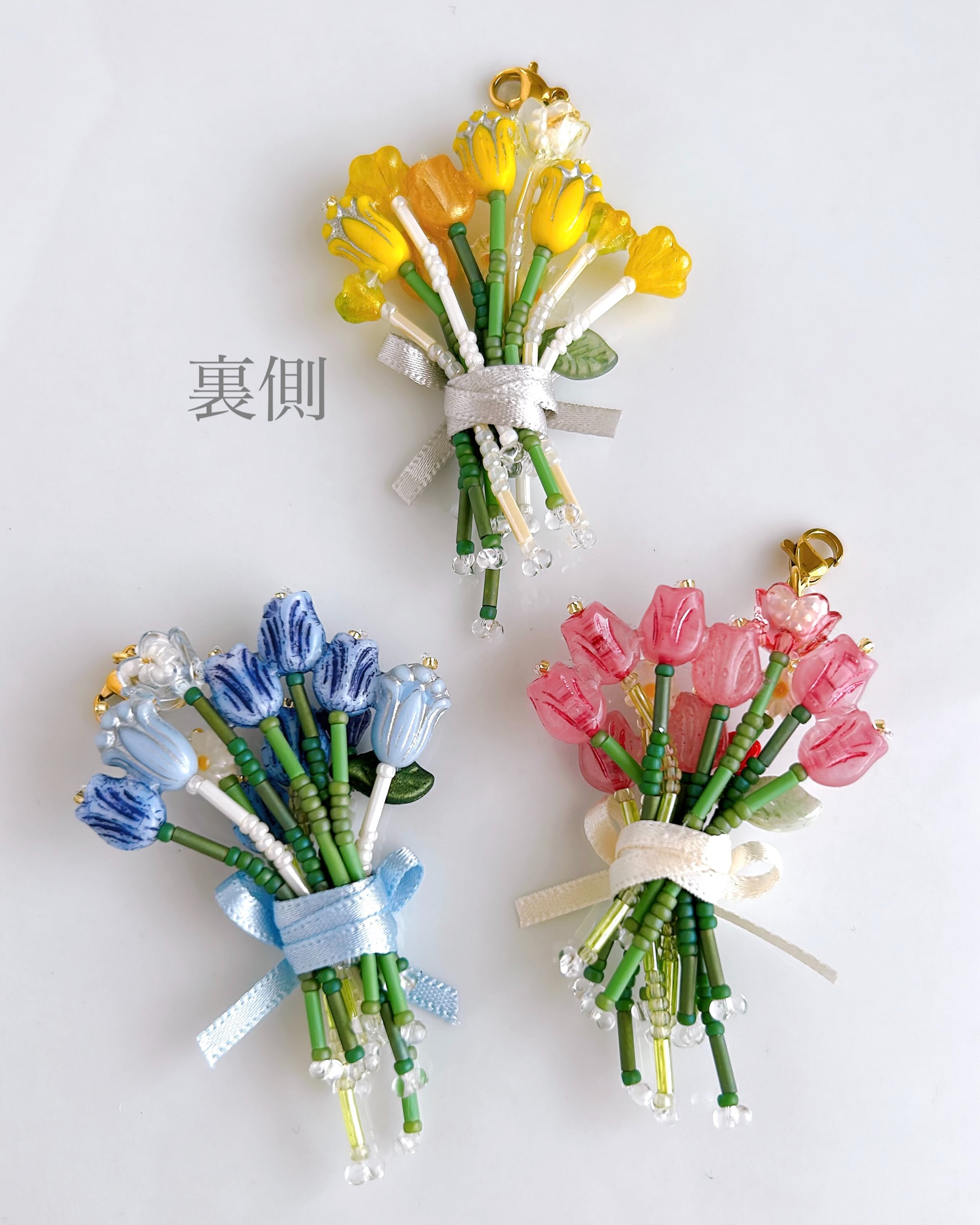 小さなチューリップをぎゅっと束ねた、ビーズの花束チャーム。