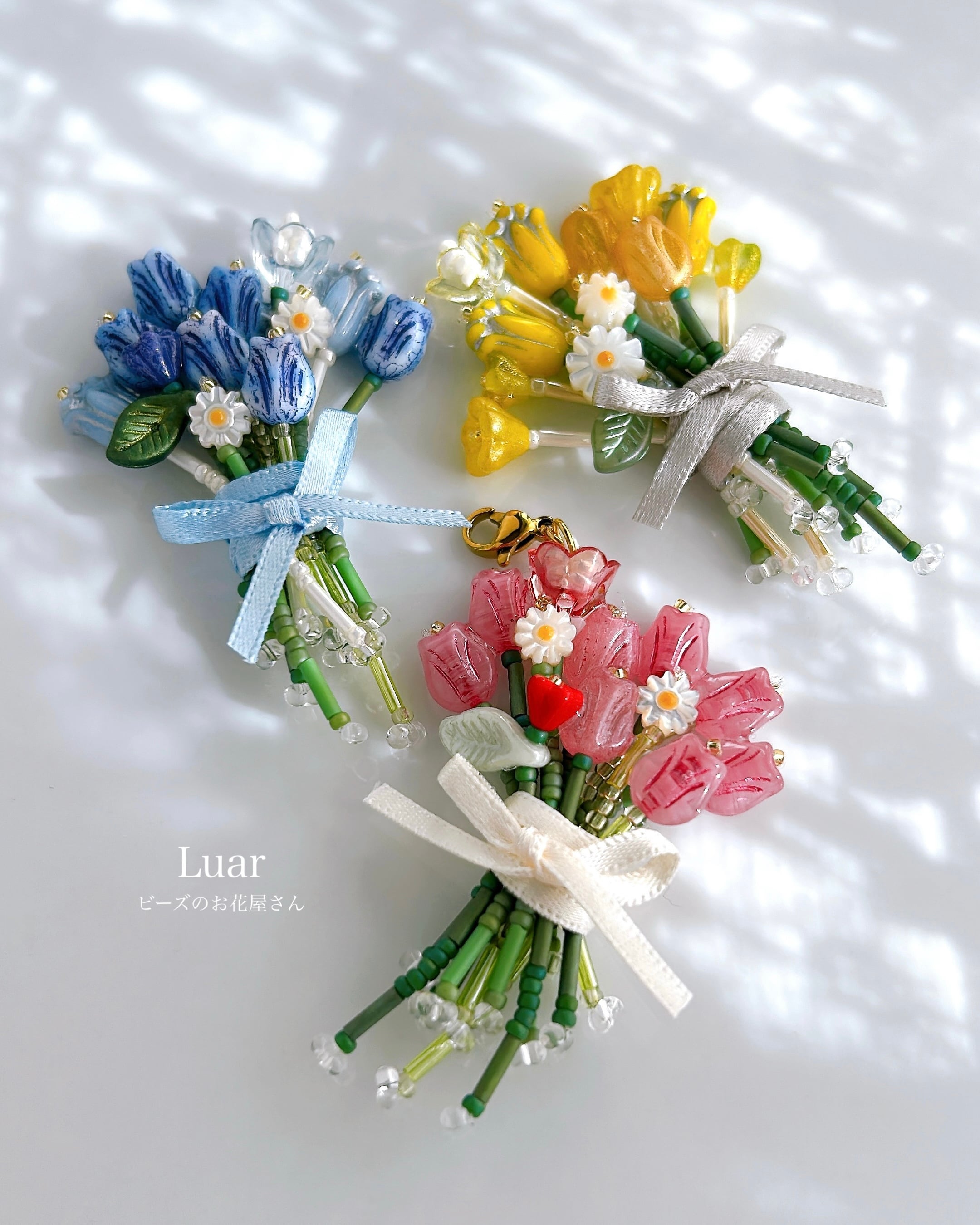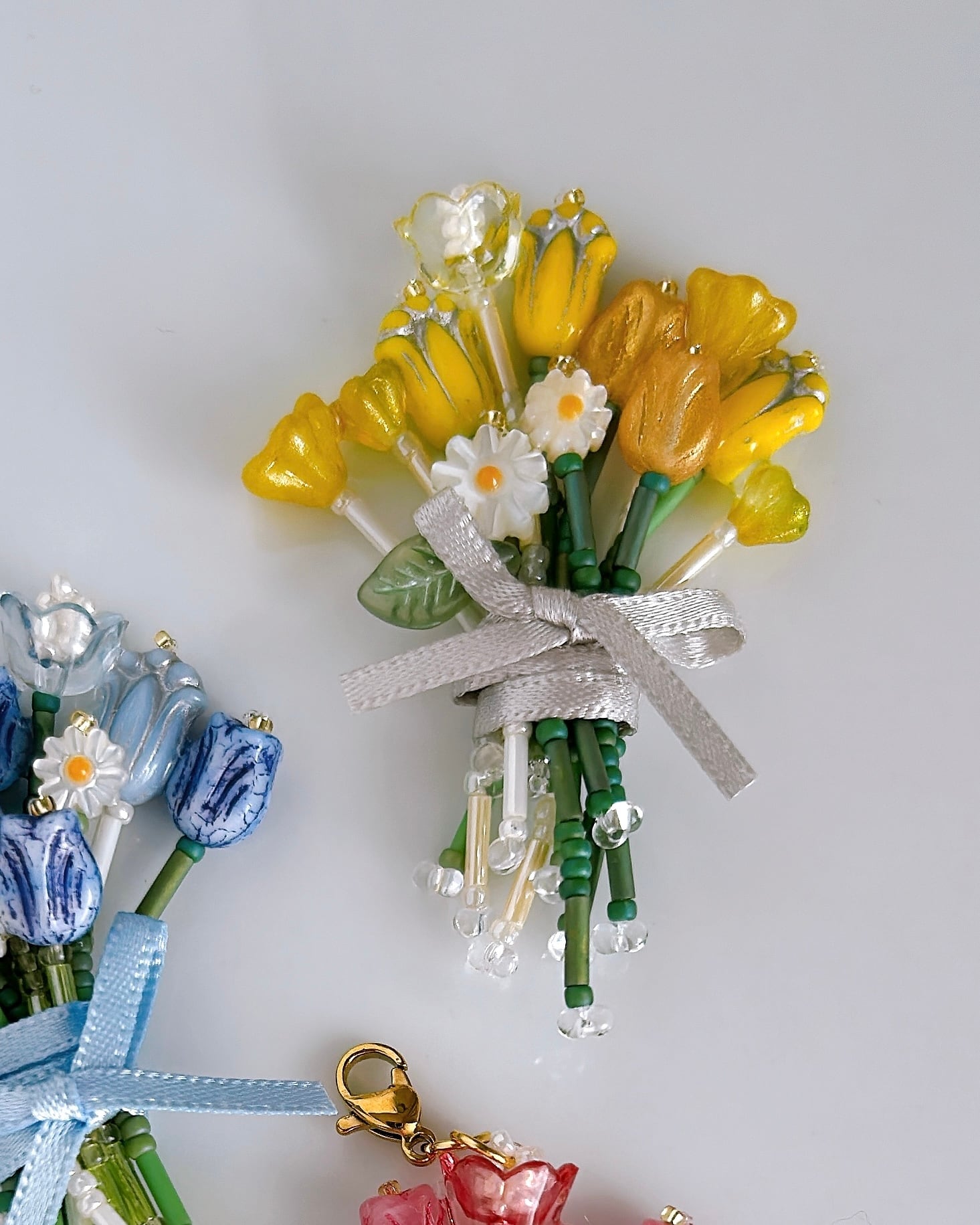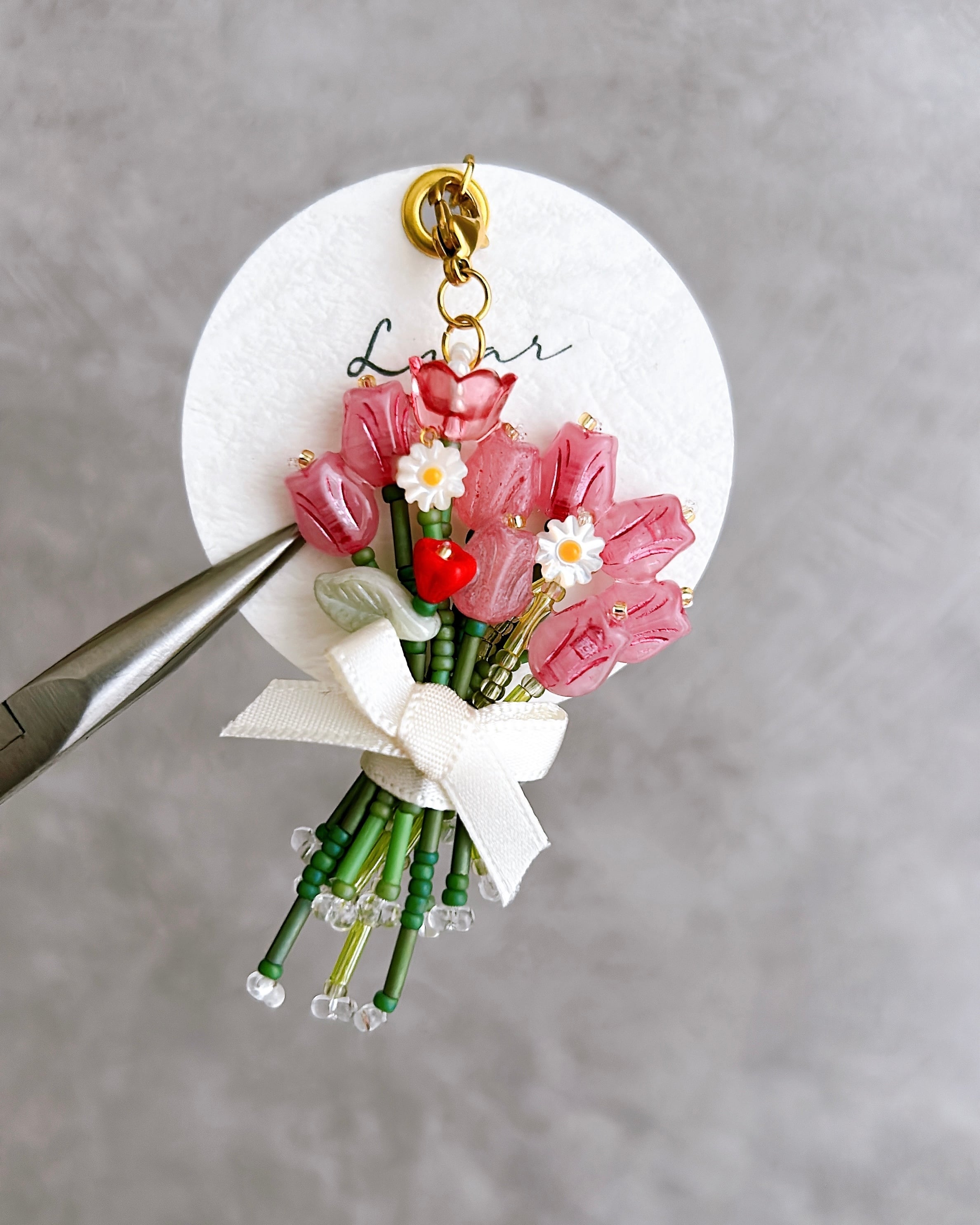 小さなチューリップをぎゅっと束ねた、ビーズの花束チャーム。