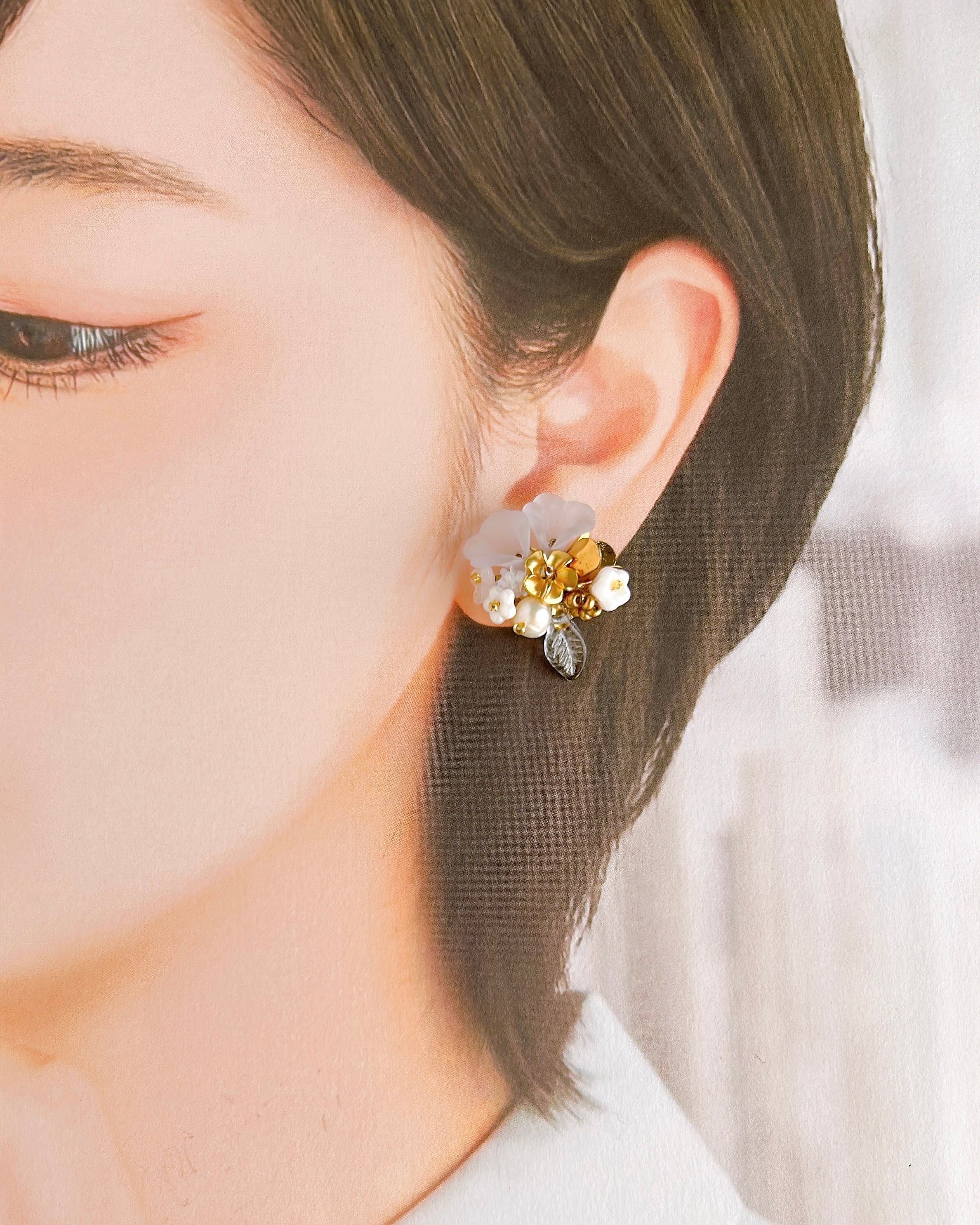 まどろみの森で摘んだような、小さな花々を束ねた耳飾り「眠り姫の花冠」。淡いブルーがほんのりとした優しさを映し出します。