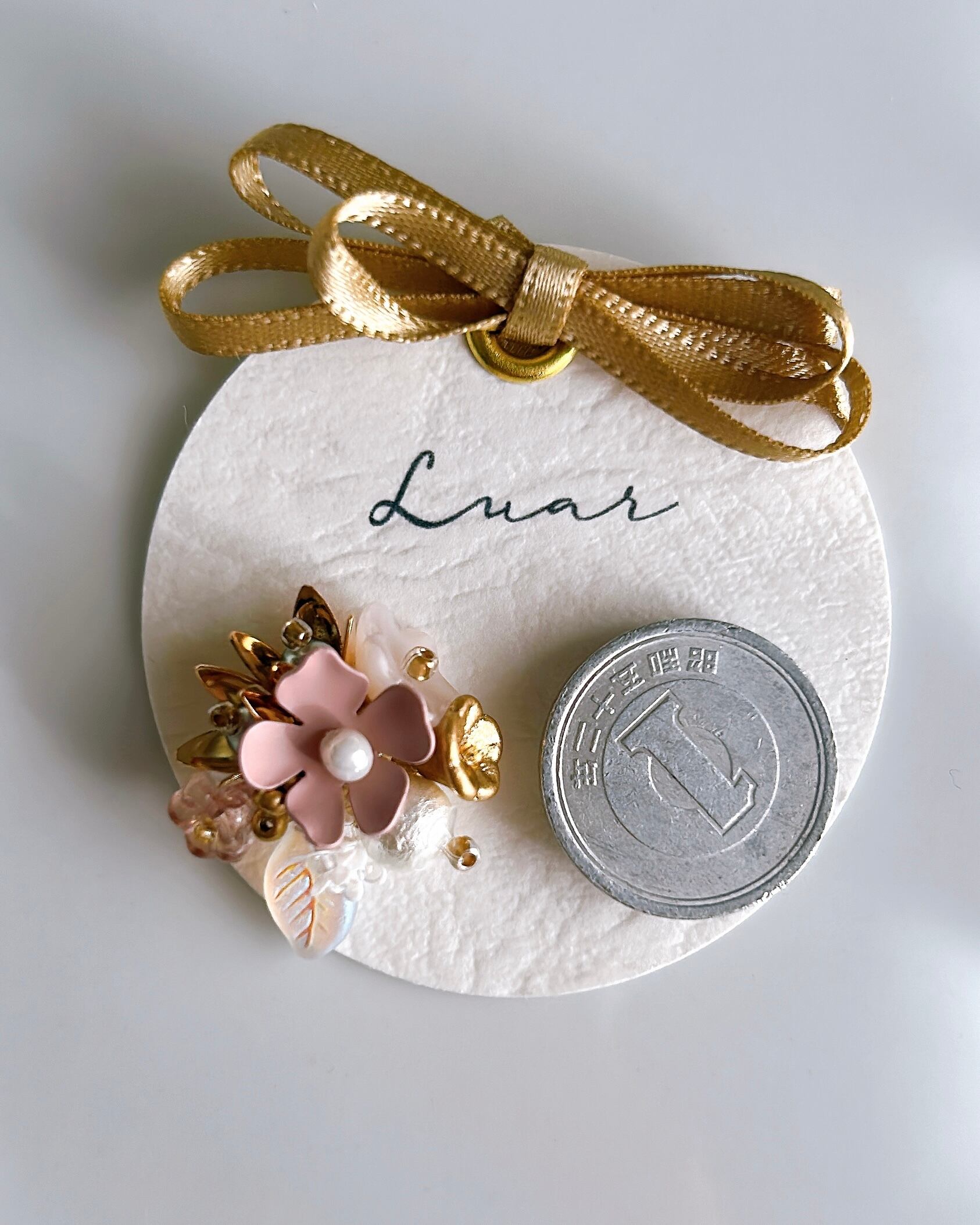 パールの柔らかな光と、すりガラスのような葉のモチーフが、可憐で夢みる世界へと誘います。