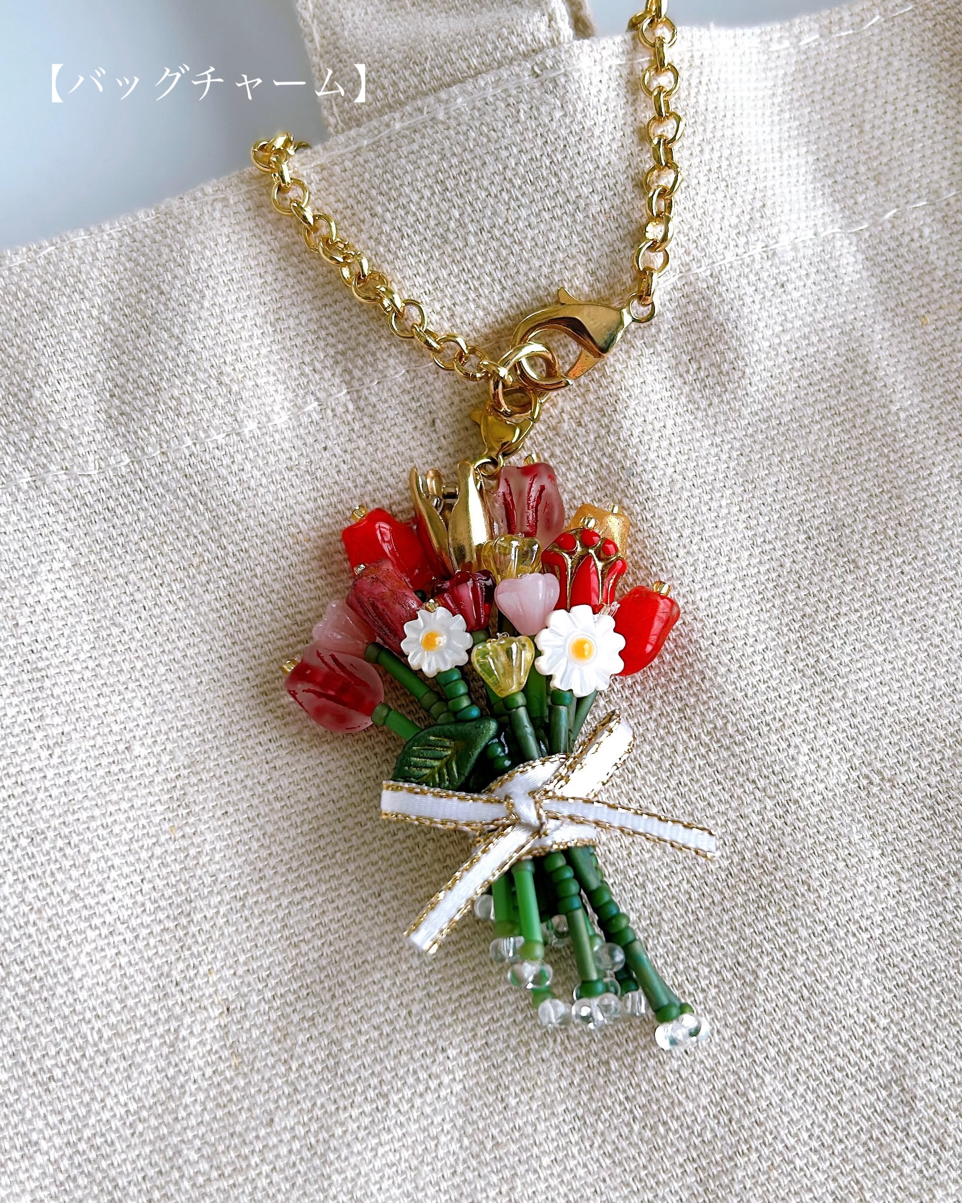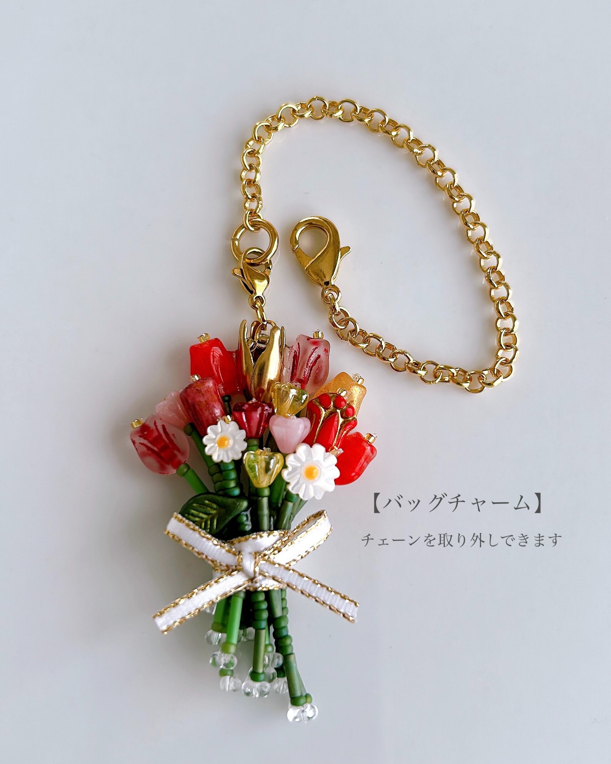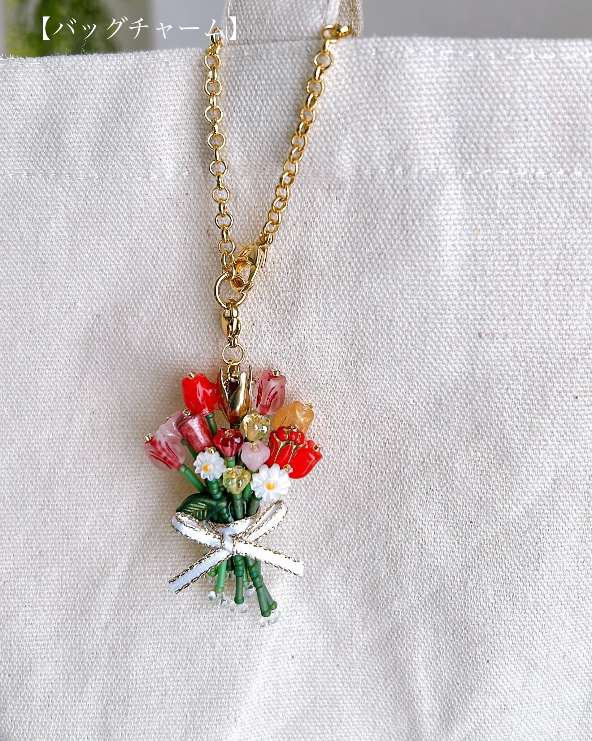 赤やピンク、オレンジ、黄色の繊細なガラスビーズを束ねた、特別な日のためのカラフルなブーケチャームです。
