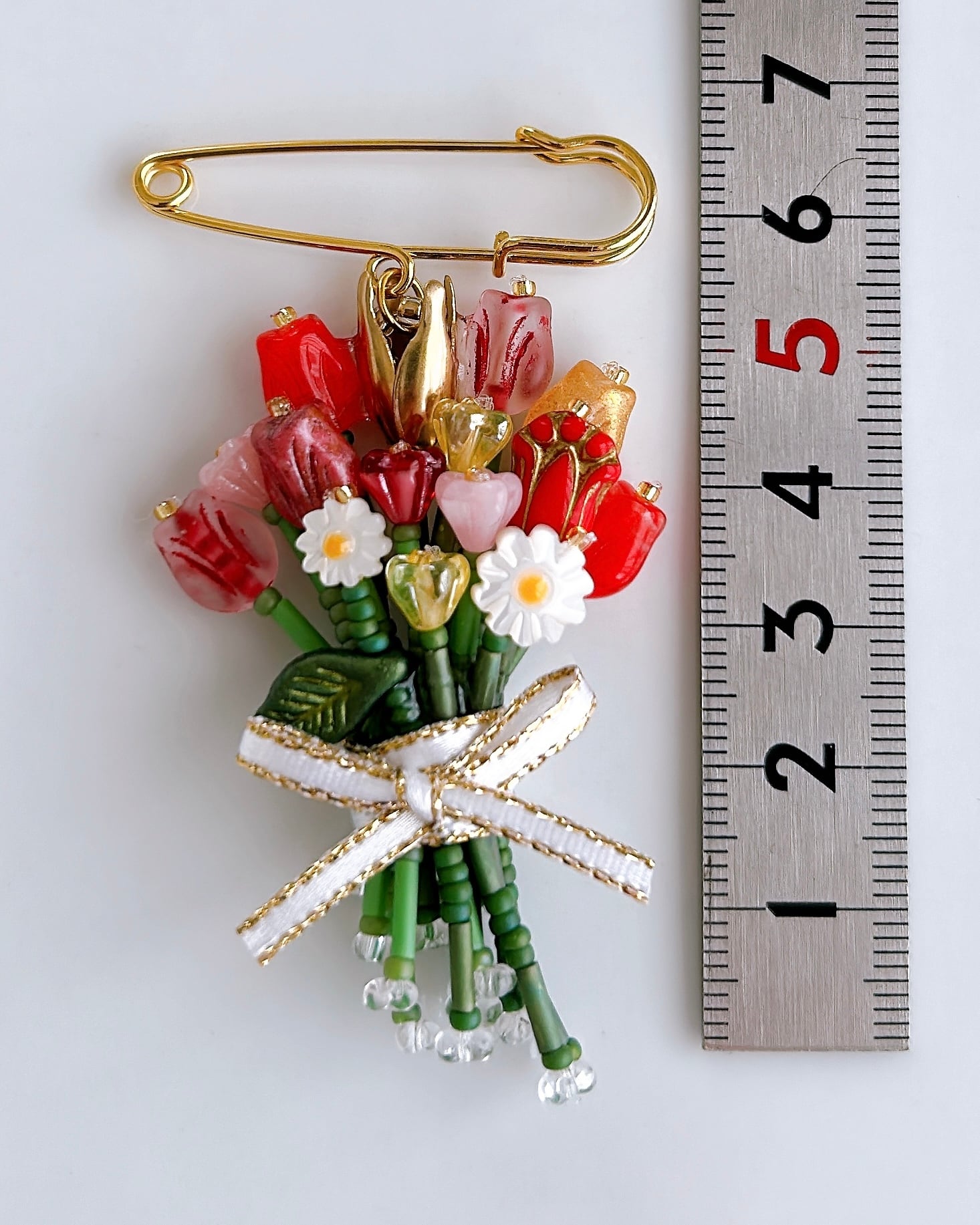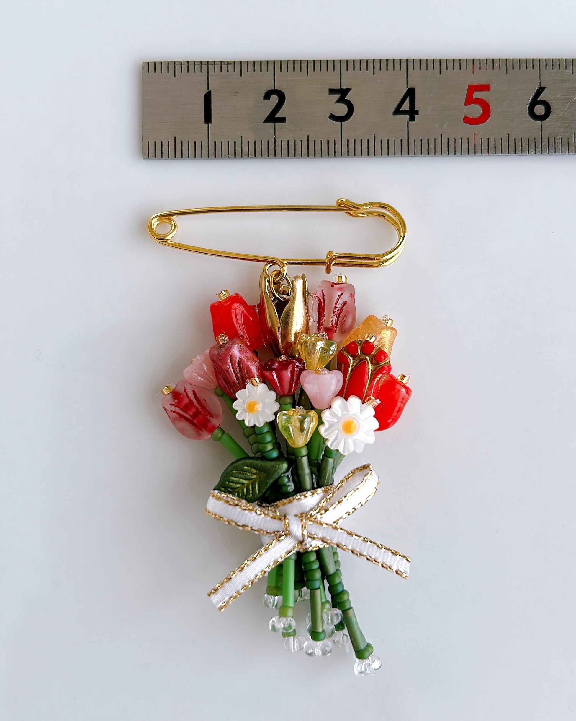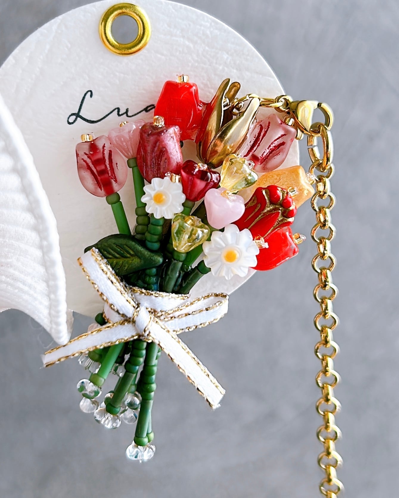 赤やピンク、オレンジ、黄色の繊細なガラスビーズを束ねた、特別な日のためのカラフルなブーケチャームです。