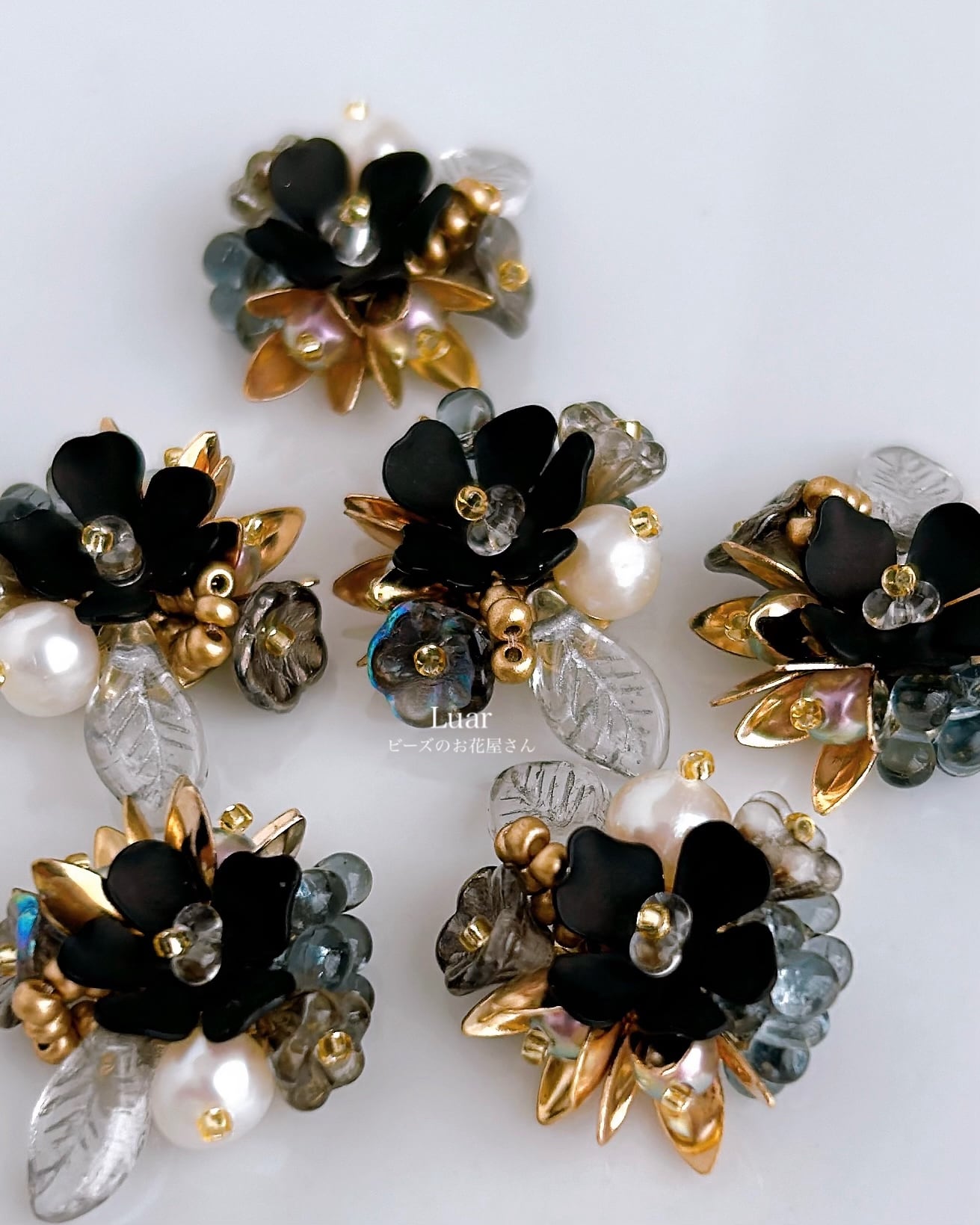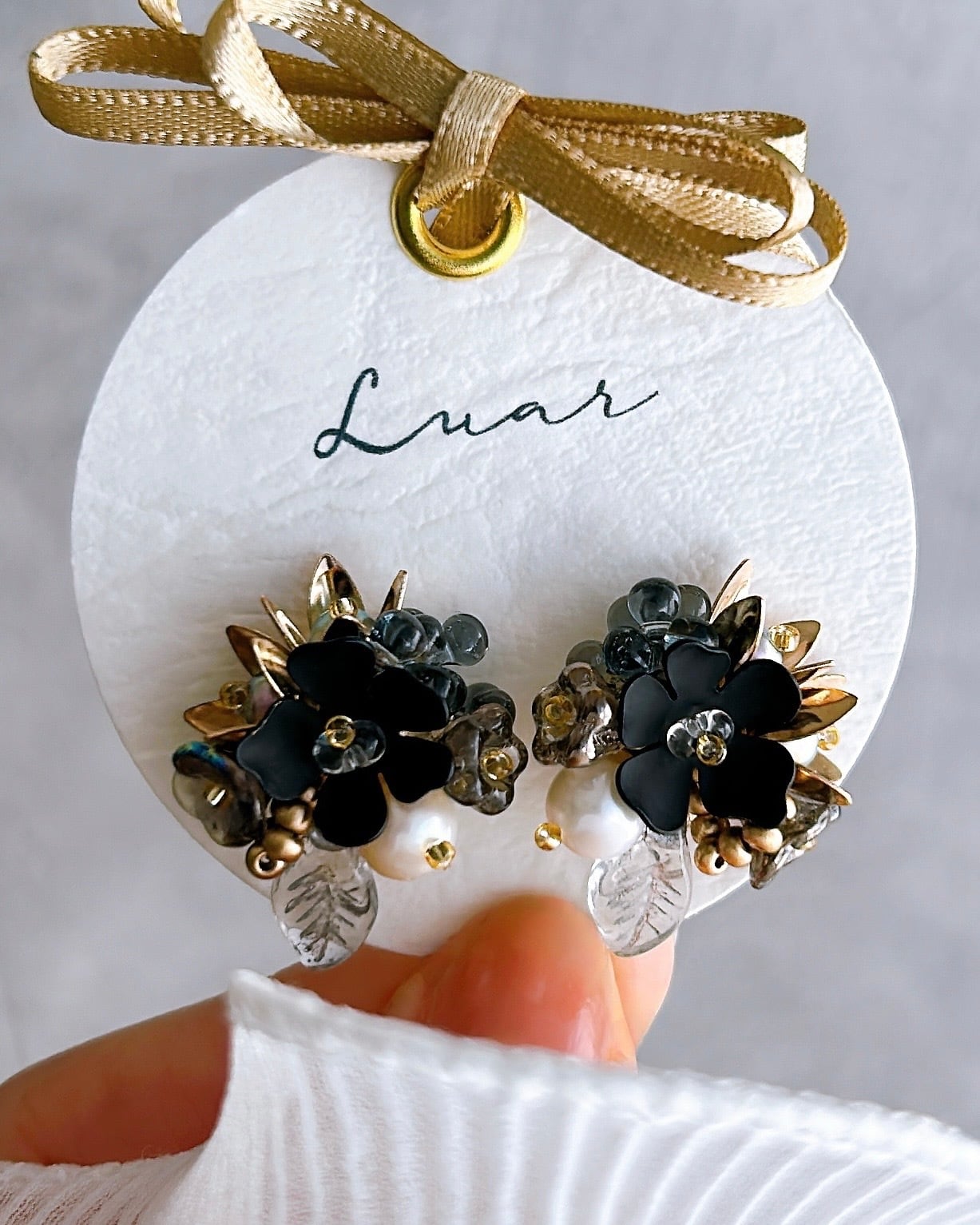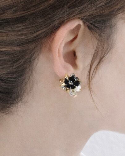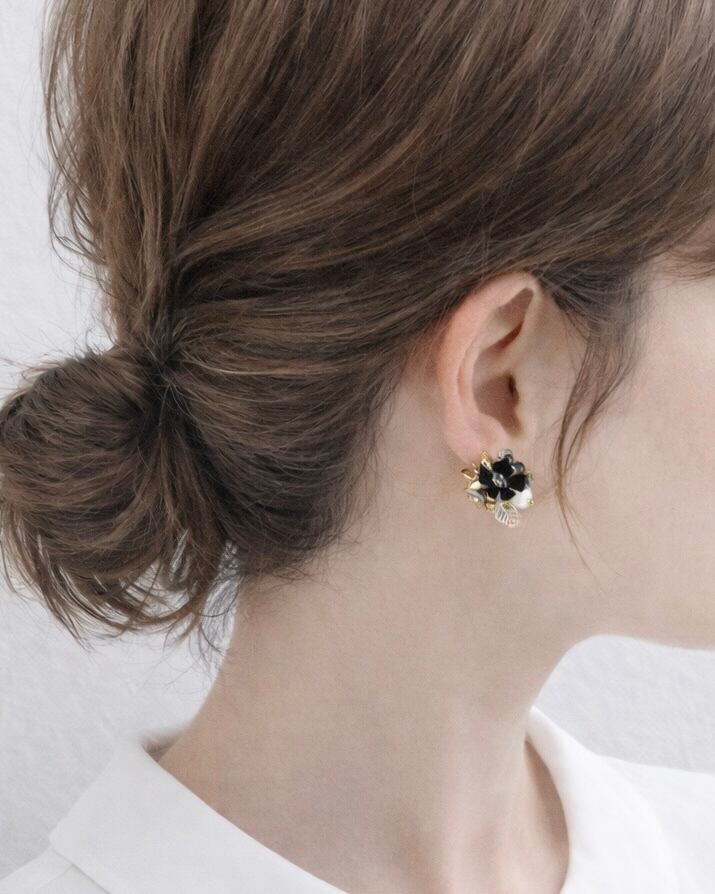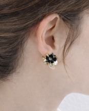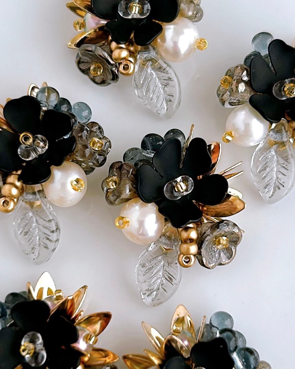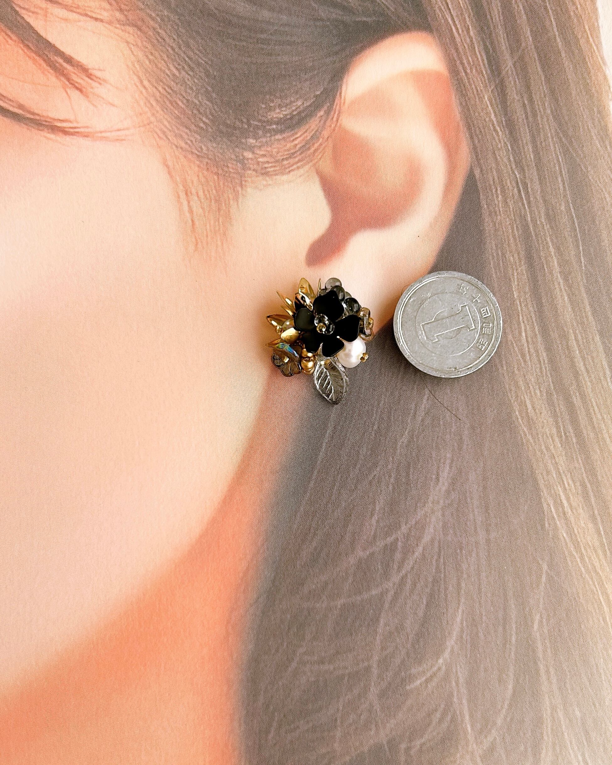 深い黒を基調に、月明かりのようにきらめく金と幻想的な透明感を添えた小さな花束の耳飾り。