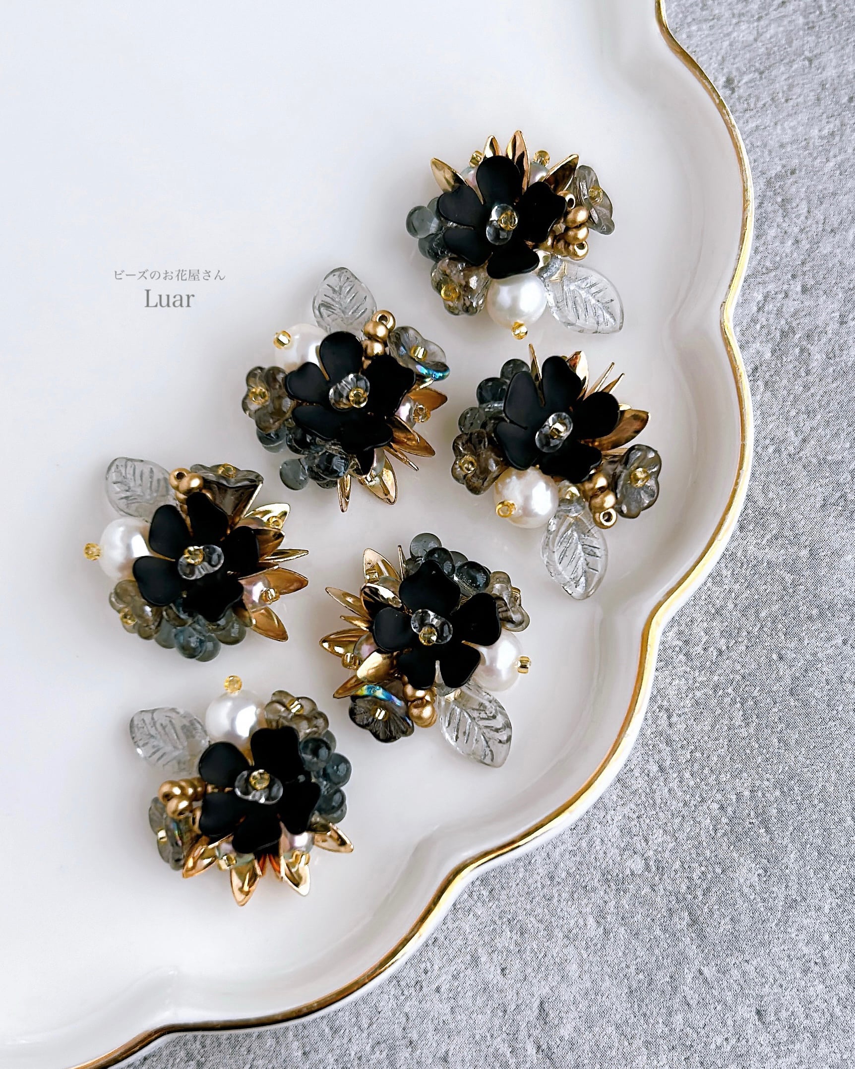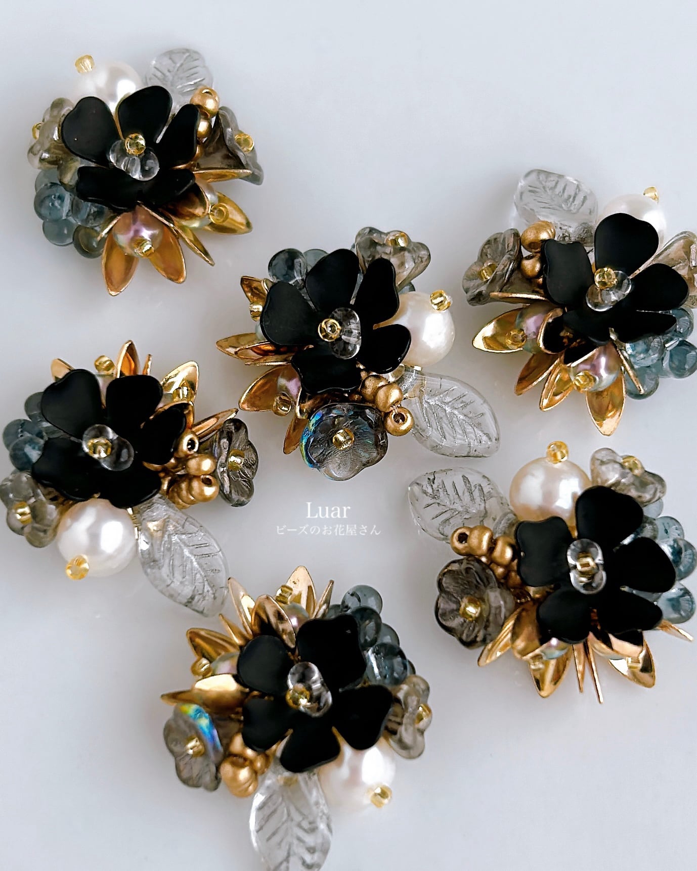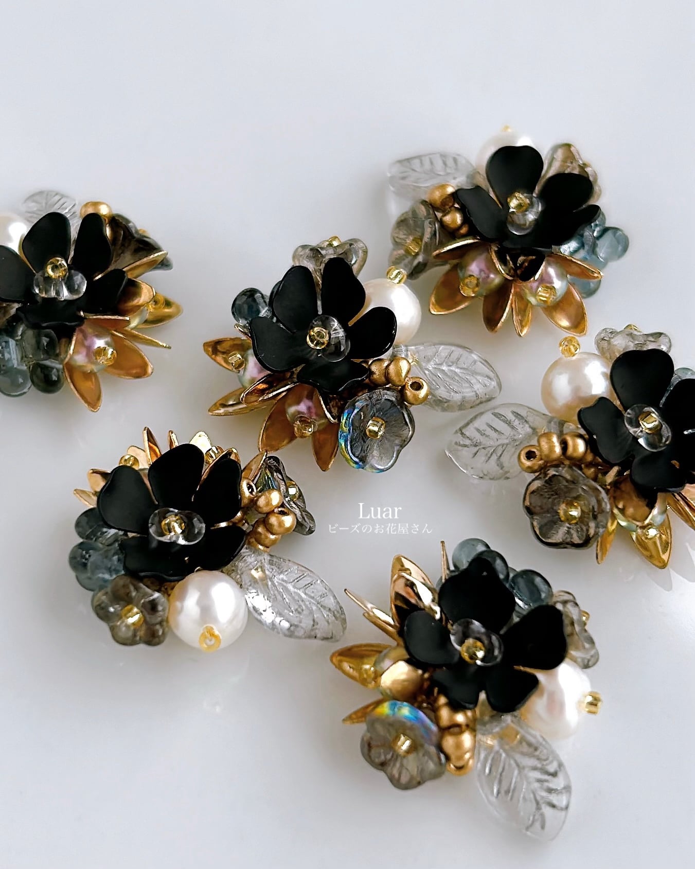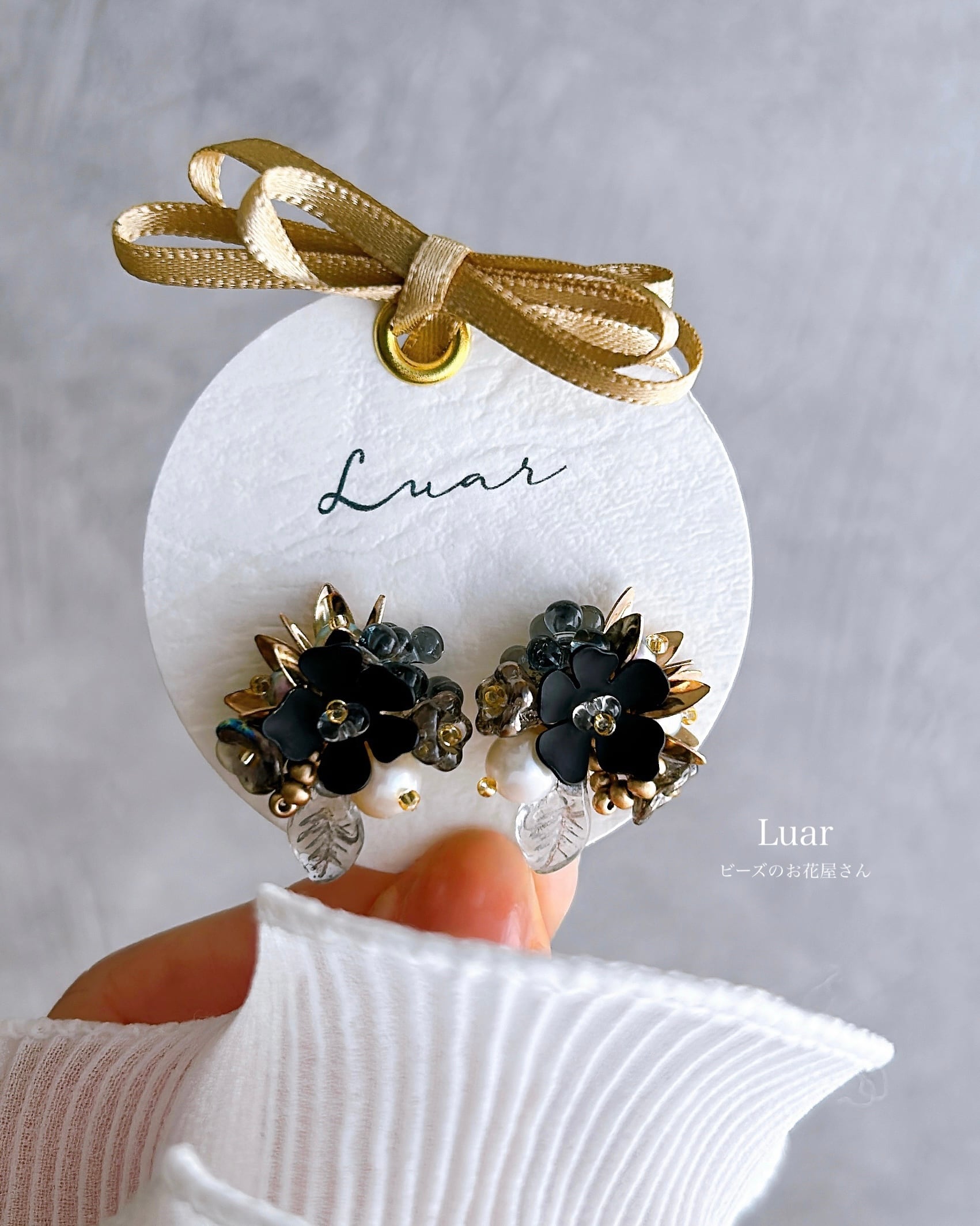 深い黒を基調に、月明かりのようにきらめく金と幻想的な透明感を添えた小さな花束の耳飾り。