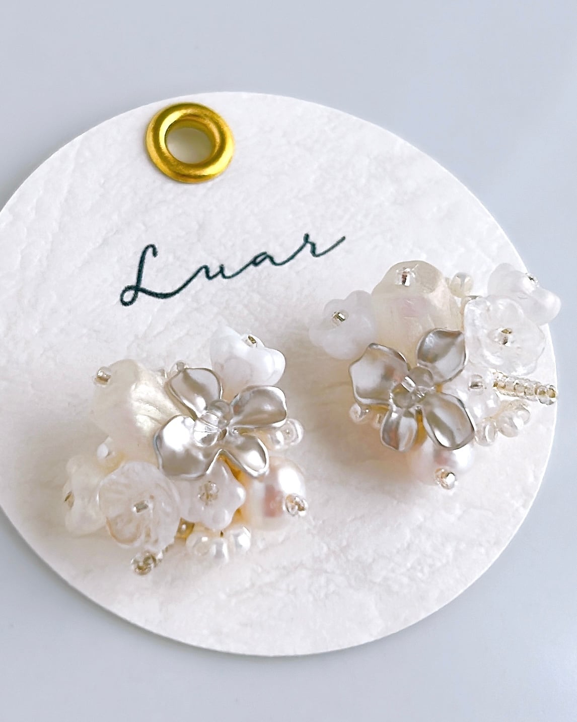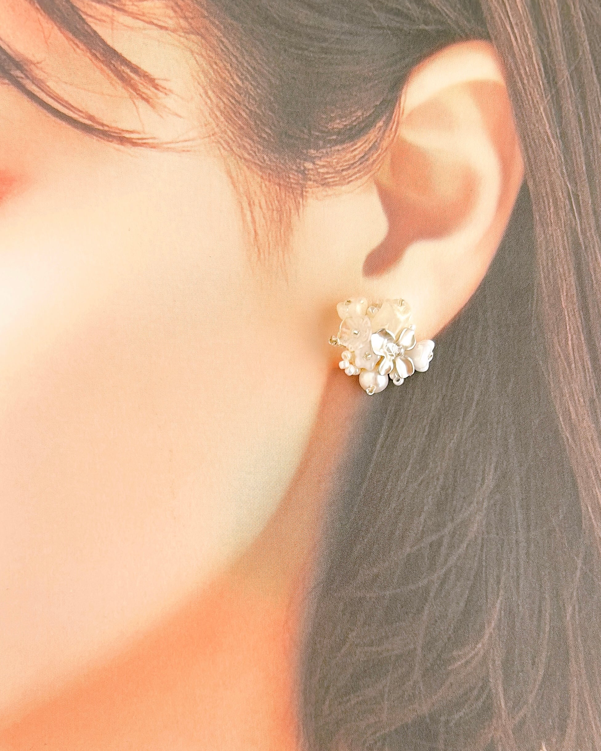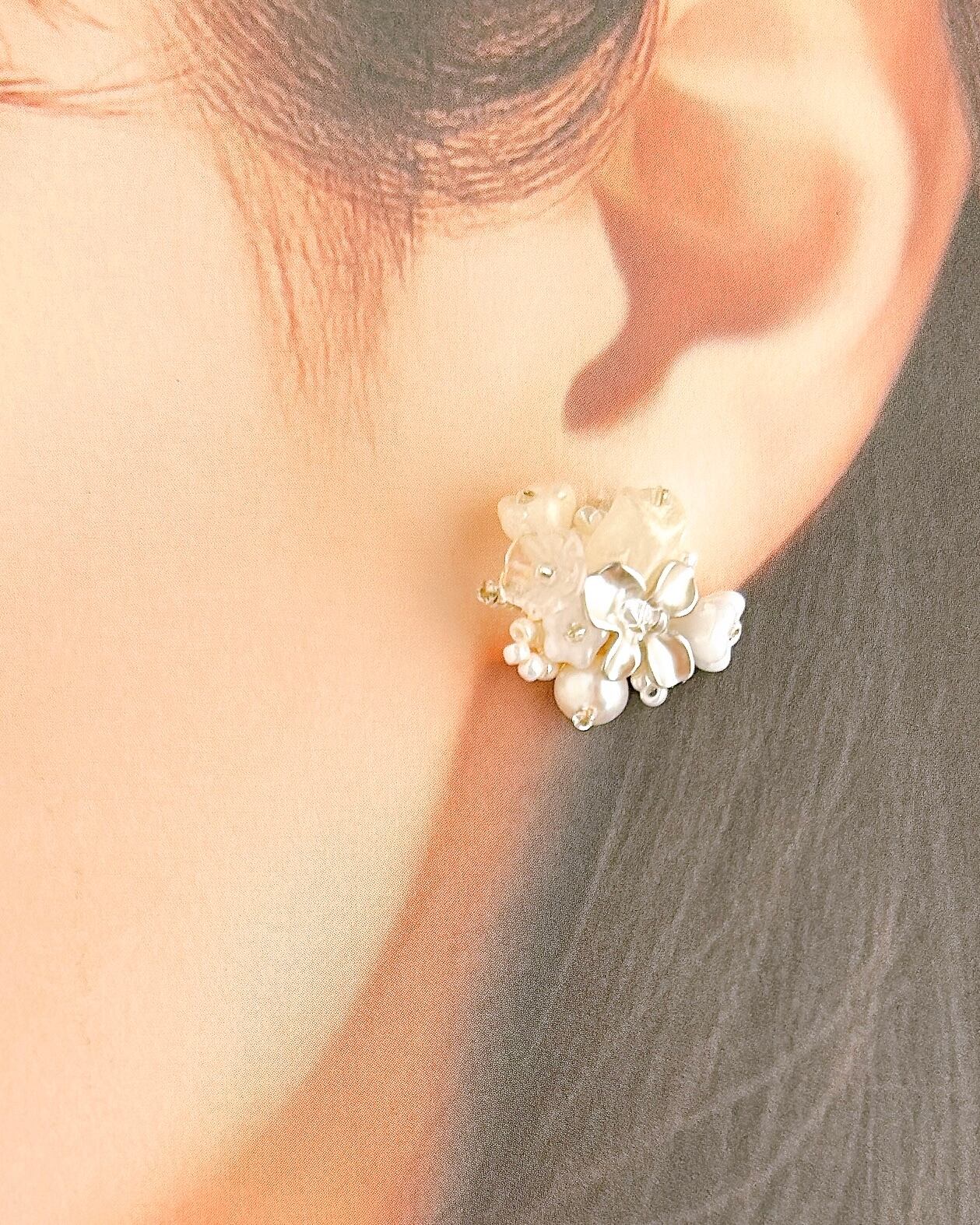 白とシルバーの上品な花束が耳元を優雅に彩ります。大人女性にこそおすすめしたい、洗練されたデザインです。フォーマルなシーンにもぴったりで、特別なコーディネートを引き立てます。