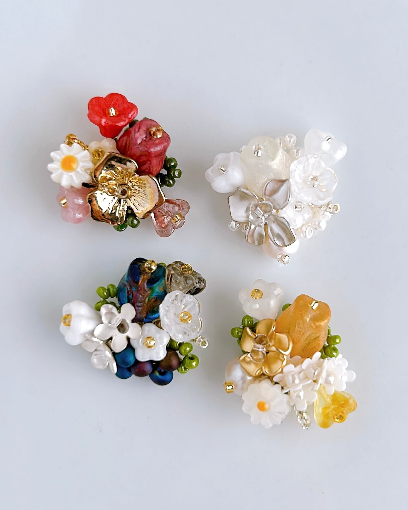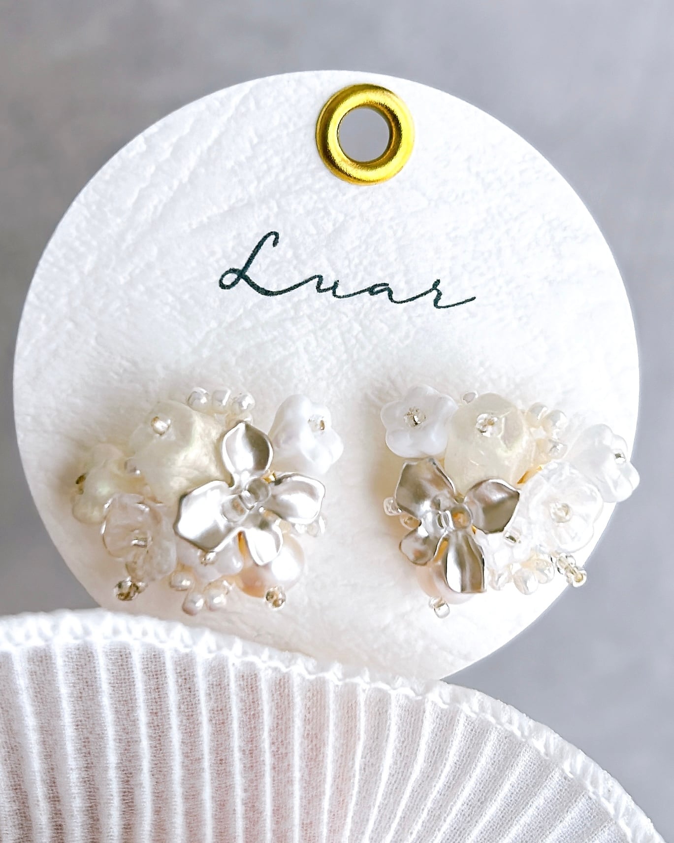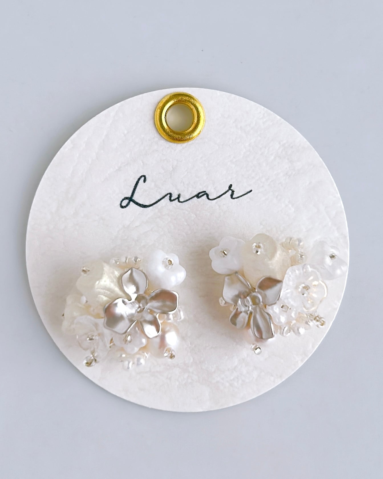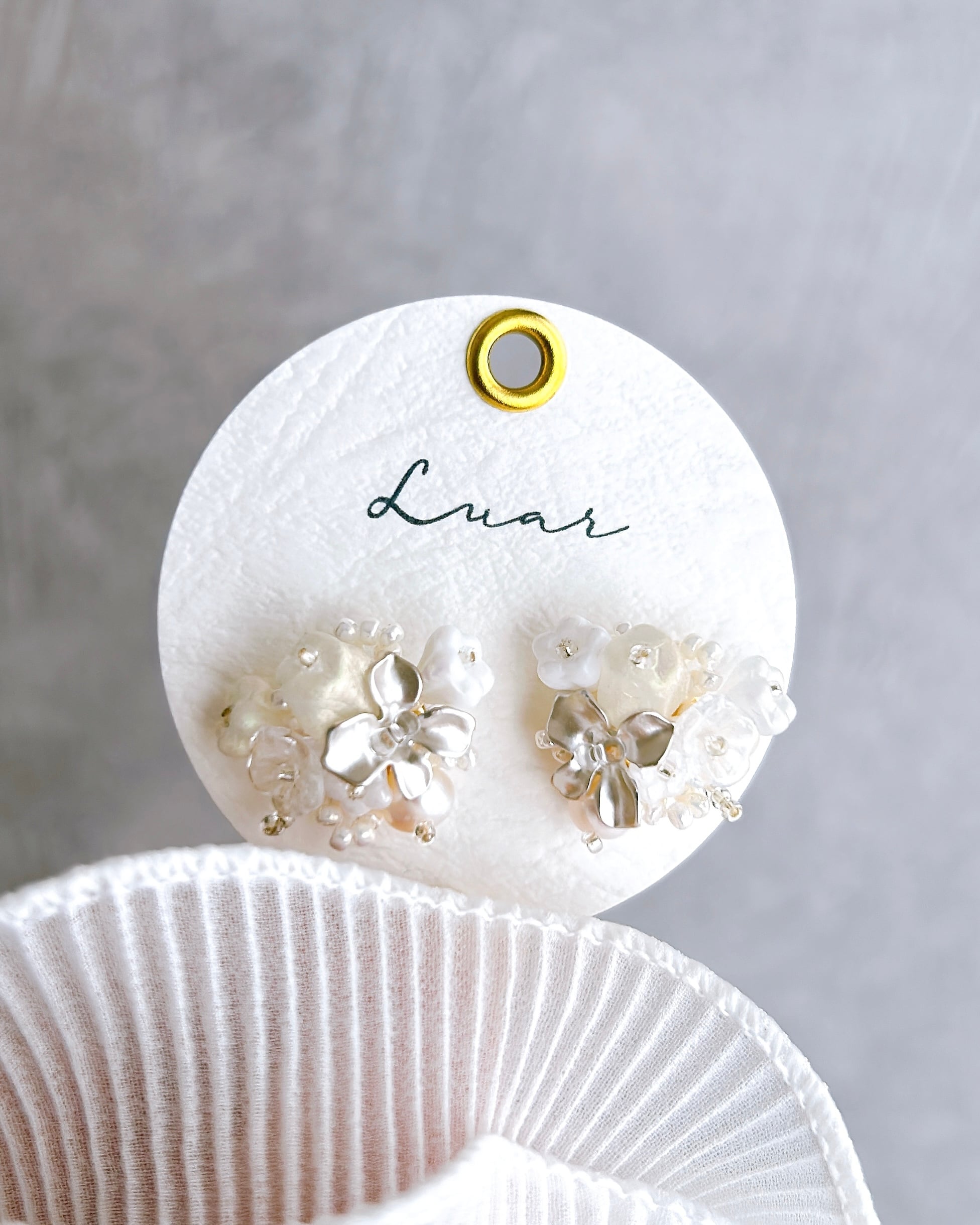 白とシルバーの上品な花束が耳元を優雅に彩ります。大人女性にこそおすすめしたい、洗練されたデザインです。フォーマルなシーンにもぴったりで、特別なコーディネートを引き立てます。