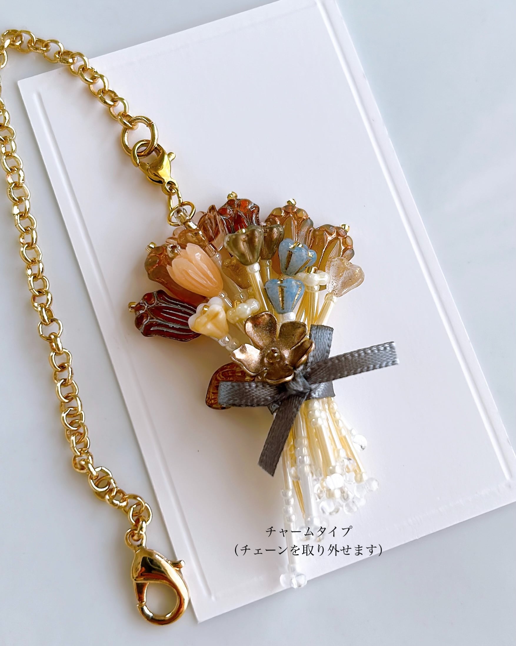 ガラスビーズの透け感が光をやさしく受け止め、揺れるたびにきらりと静かな輝きを見せてくれます。
