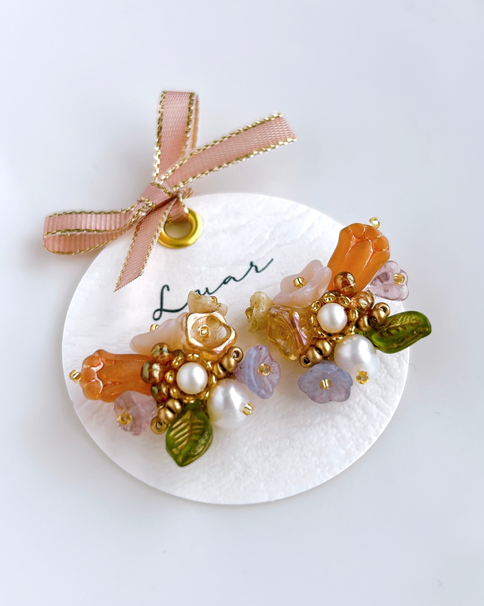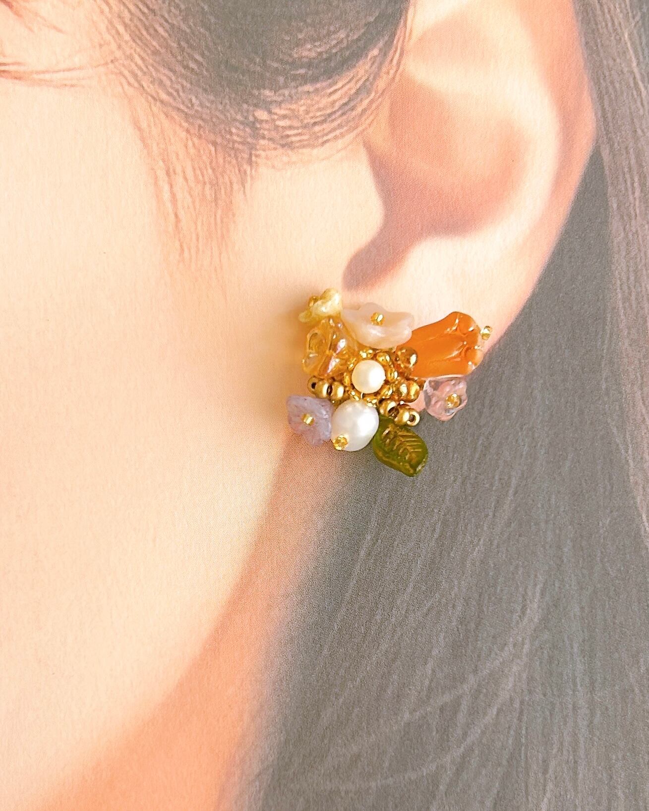 オレンジやピンク。砂糖菓子のようなやわらかな色合い。小さなお花とパールをぎゅっと束ねた、花束の耳飾りです。