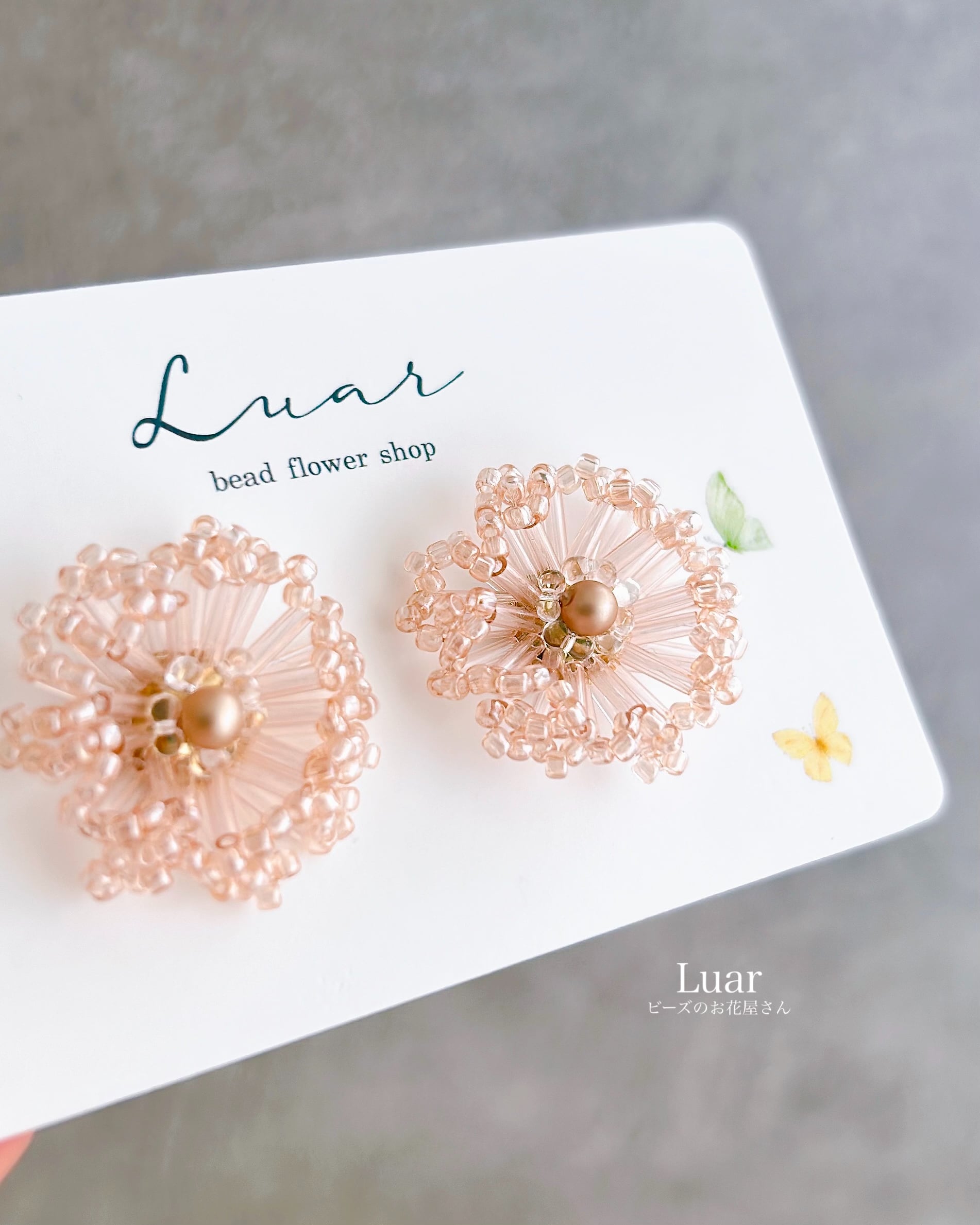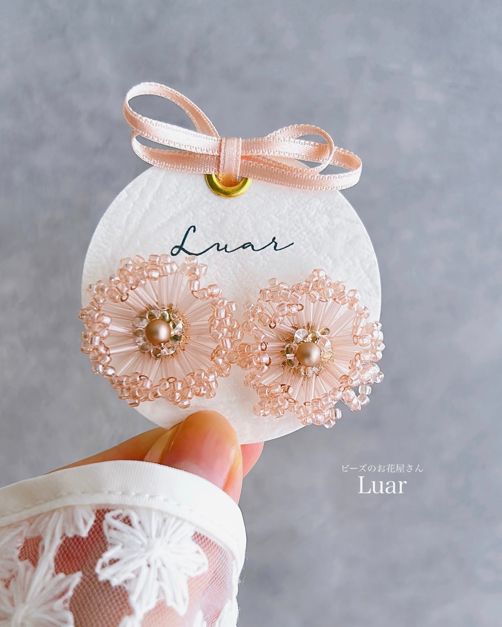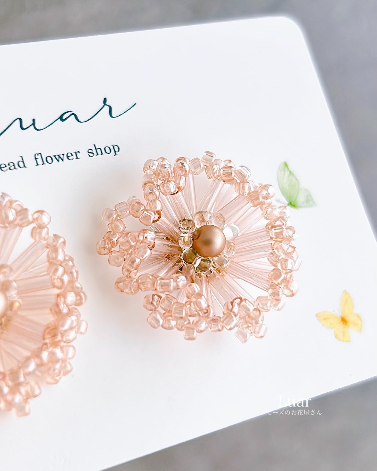 繊細なガラスビーズをひと粒ずつ編み上げ、ドレスの裾のようにひらひらと広がるかたちに。