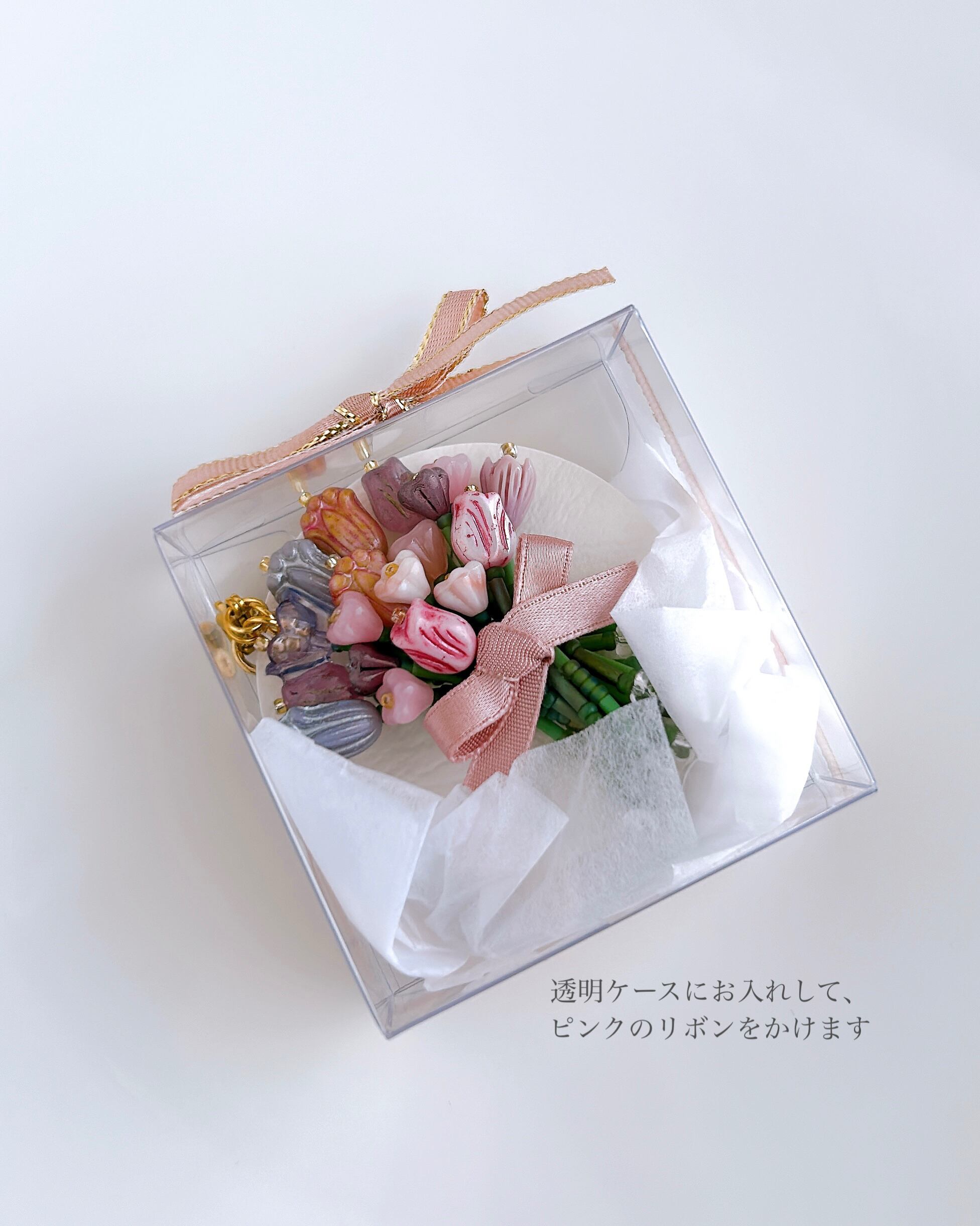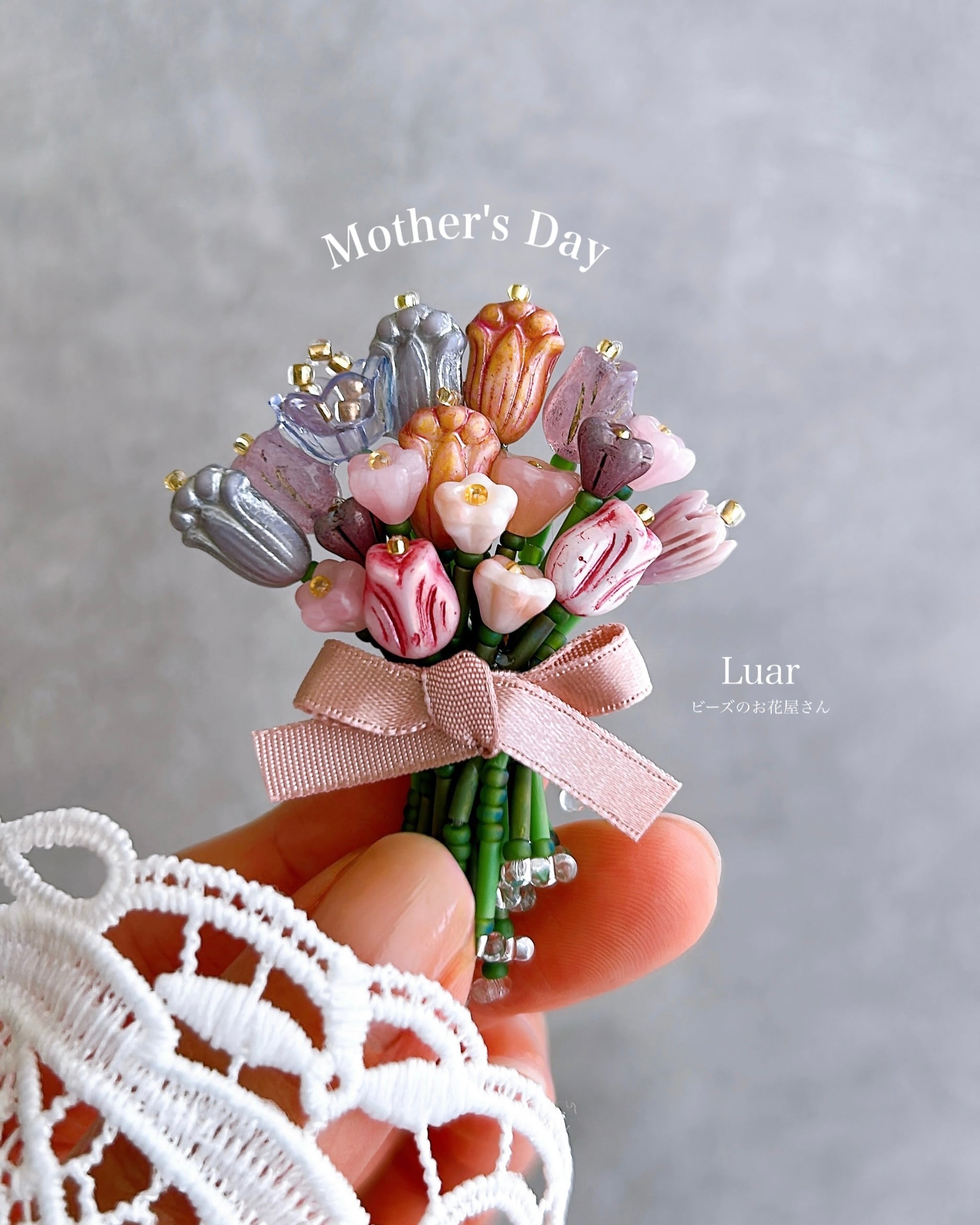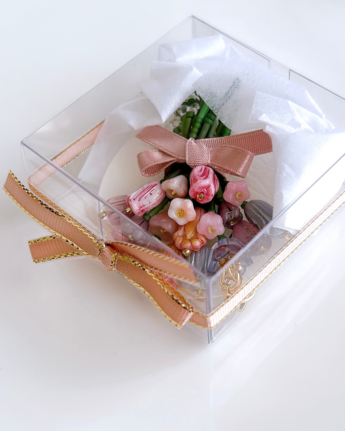 やわらかなピンクや淡いパープル、くすみピンクのリボンが溶け合い、優しく咲きそろうビーズの花束です。