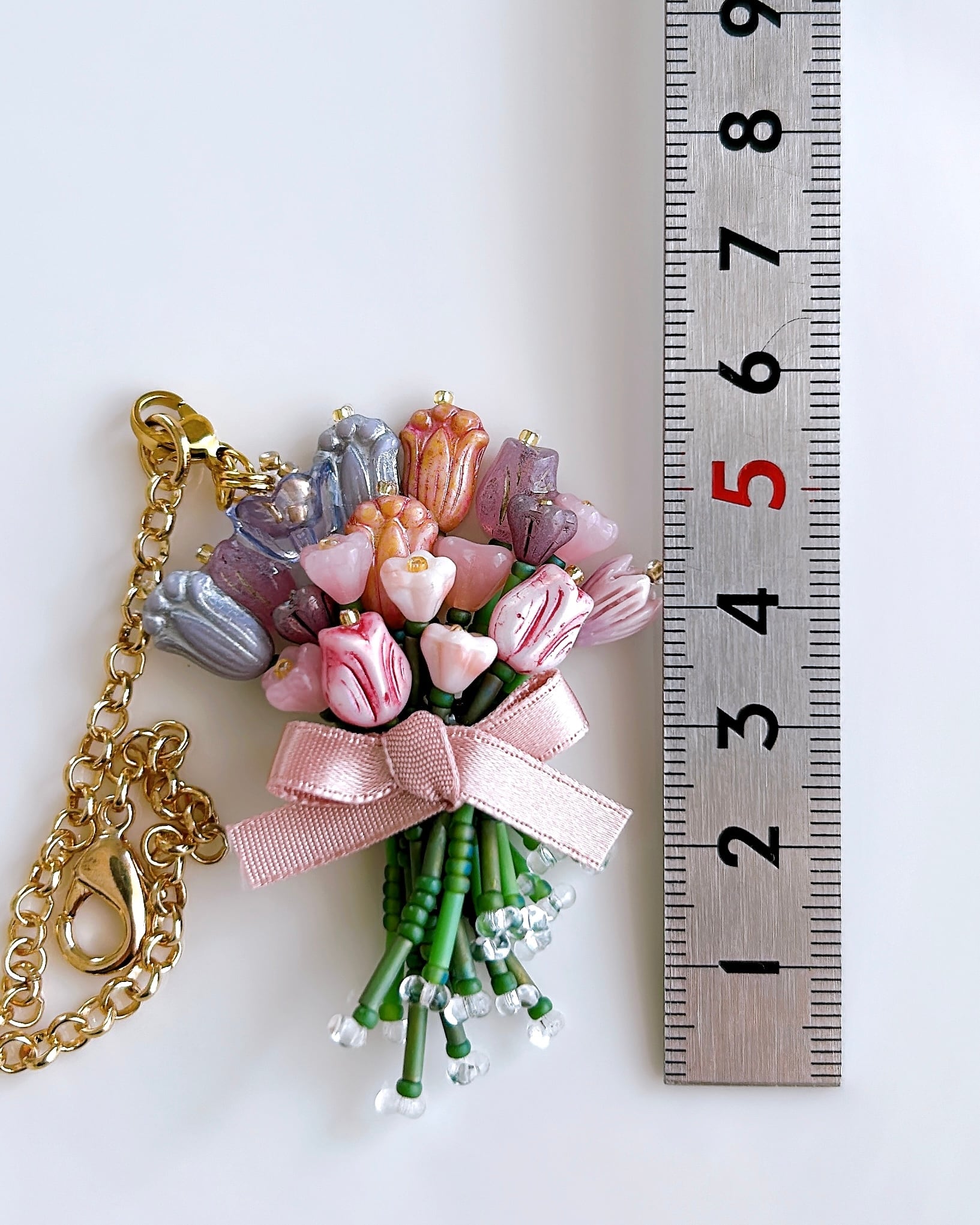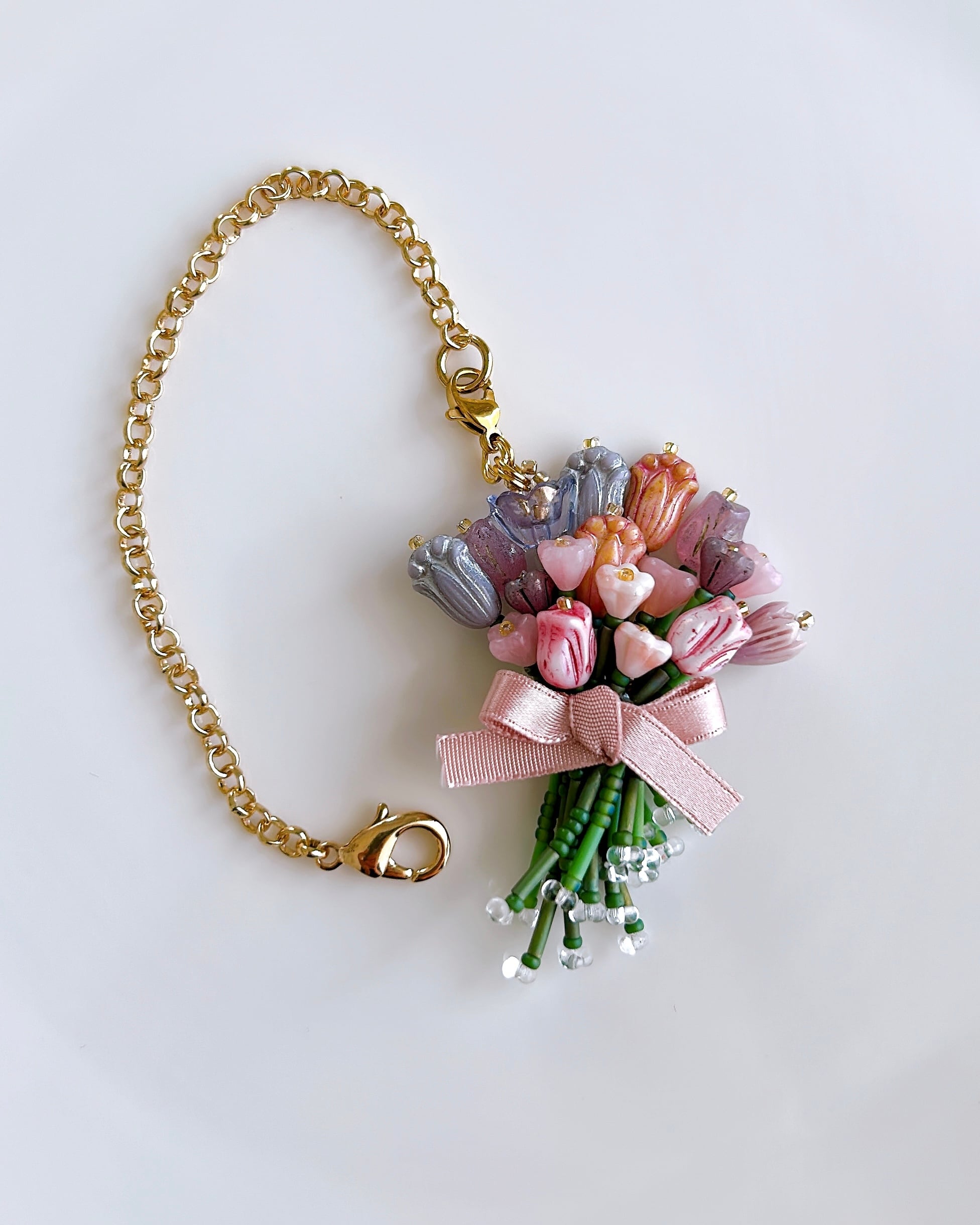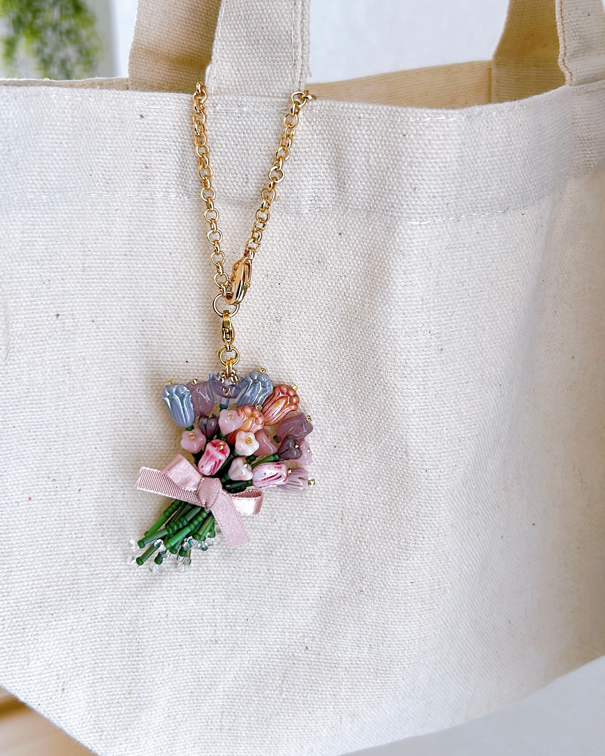 やわらかなピンクや淡いパープル、くすみピンクのリボンが溶け合い、優しく咲きそろうビーズの花束です。